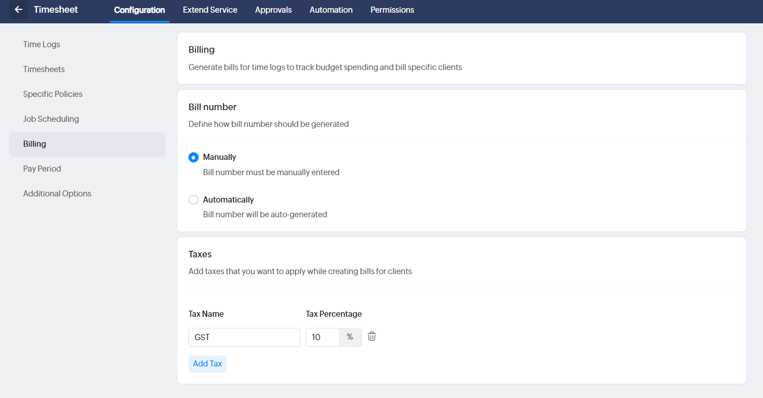 Zoho Peopleでは、従業員が行った業務やプロジェクトの工数をもとにクライアントに請求できます。請求書に適用する税金の設定にも対応しています。