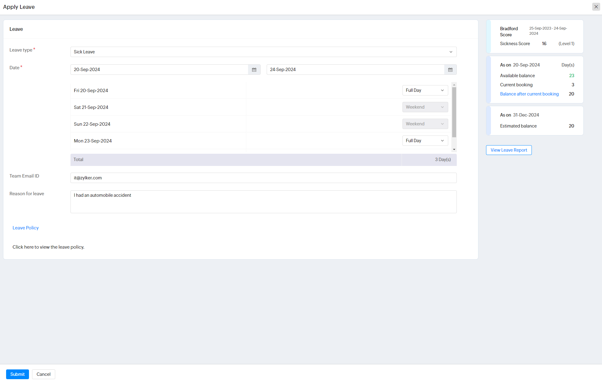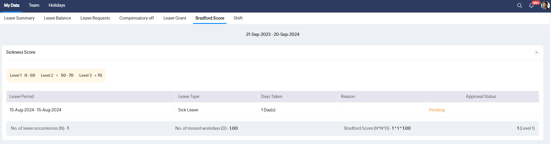 Zoho Peopleにおけるブラッドフォードスコアとは、従業員の欠勤状況を評価するための指標です。このスコアでは、短期間に頻繁に欠勤することが、職場の生産性に与える影響を測定できます。