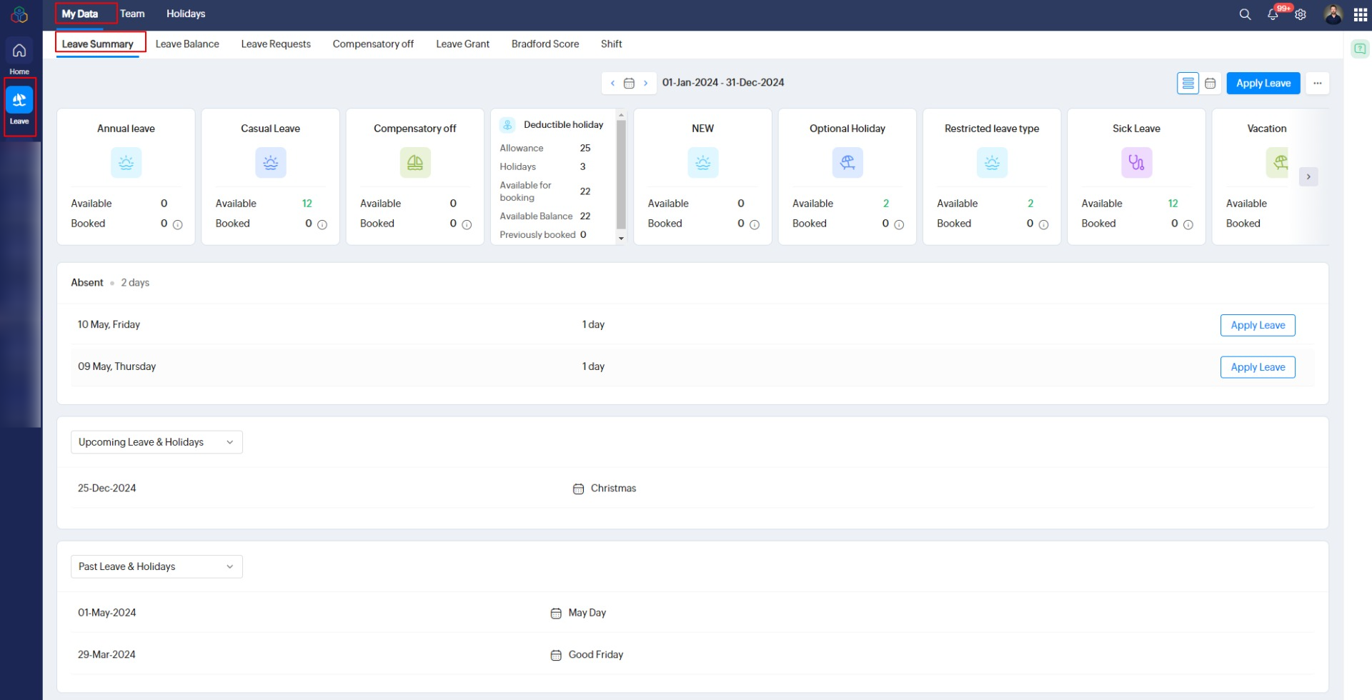 休暇管理の機能は、画面左側のメニューで[休暇管理]をクリックすると利用できます。[休暇管理]タブでは、休暇の概要や残数といった、休暇に関するすべての情報を一元管理できます。また、ユーザーは、休暇に関する申請を追加したり、休日を確認したりできます。この機能には、従業員、上司、管理者など、すべての役割のユーザーがアクセスできます。