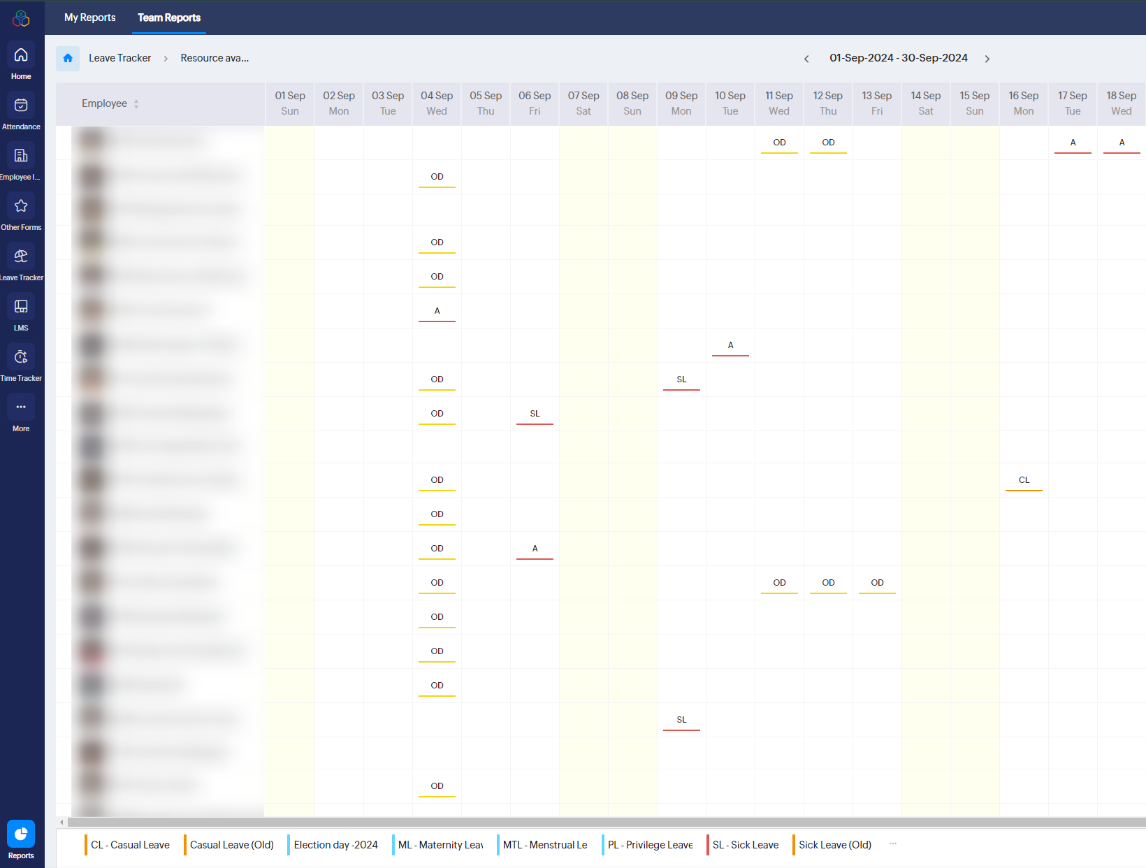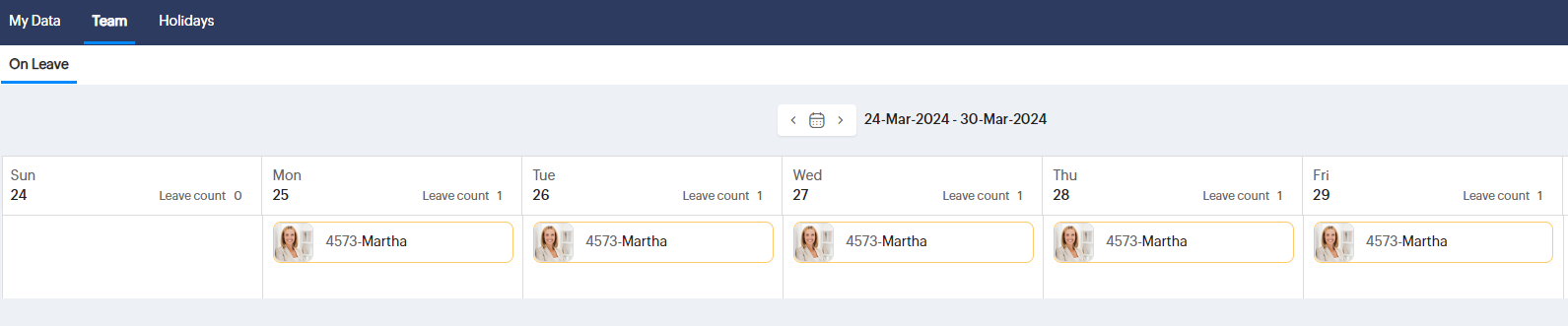 1. 従業員は、[チーム]タブで自分のチーム/プロジェクトメンバーが休暇中かどうかをすばやく確認できます。