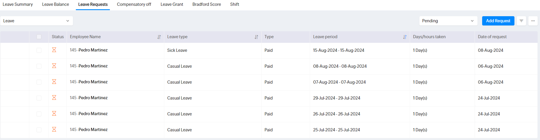 休暇申請を取り消すには、[休暇申請]タブに移動して、未承認の申請を選択し、[休暇をキャンセルする]をクリックします。複数日にわたる休暇申請の場合、従業員は日付の隣にあるチェックボックスを使用して、部分的にキャンセルできます(ただし、この機能が有効になっている場合に限ります)。