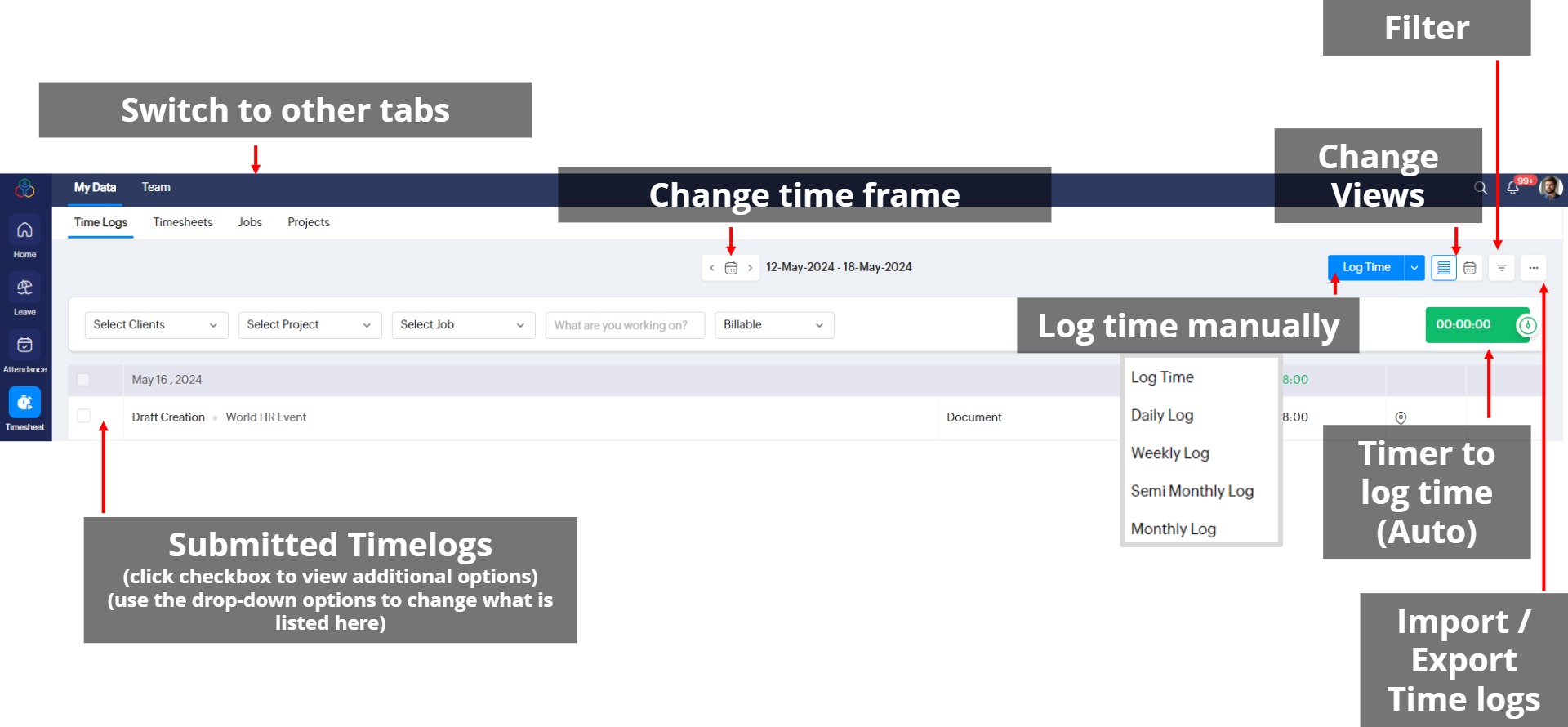 [工数の記録]タブでは、手動またはタイマーを使用した工数の記録、表示形式の切り替え、フィルターの適用、工数の記録のインポート/エクスポートなどの操作が可能です。