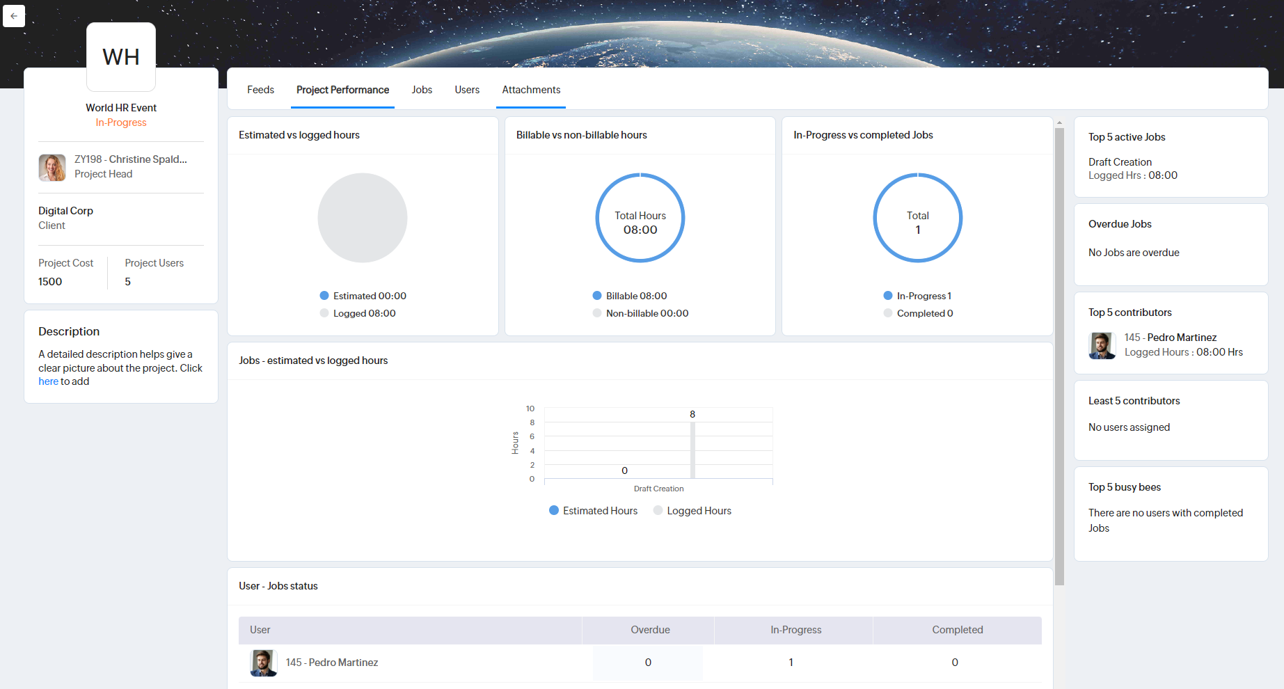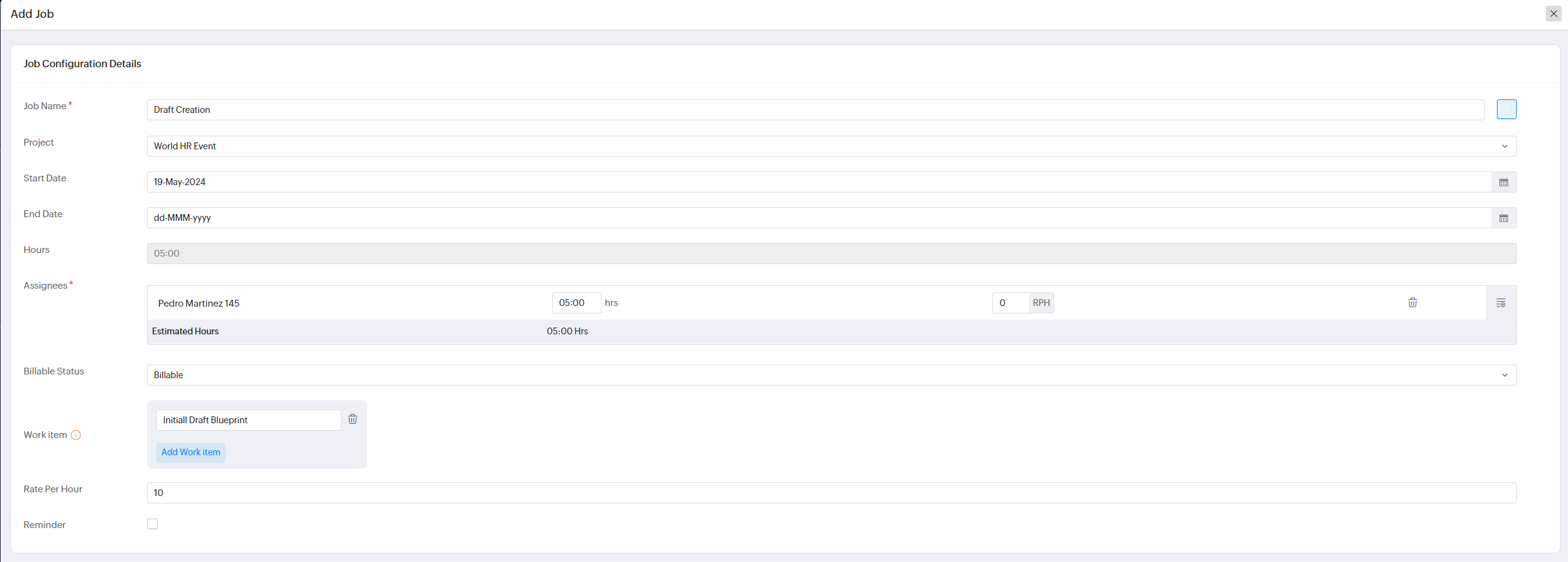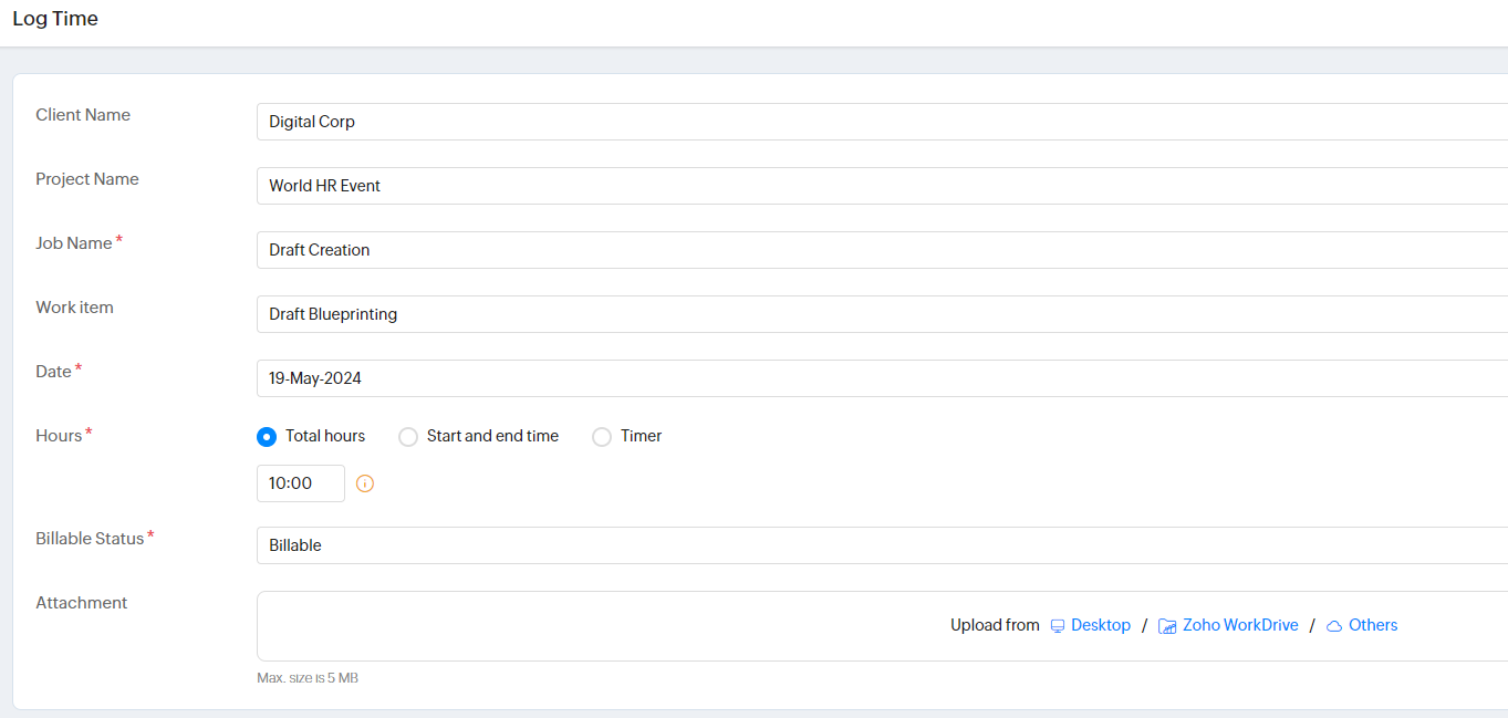 2. 該当するプロジェクトを選択します(プロジェクトは自分自身または管理者が作成できます)。業務内容を入力します。業務内容には、開始日(進行中の業務の場合は終了日をスキップ)、時間、時間単価、請求可能なステータス、および該当する場合は作業項目を含めることができます。