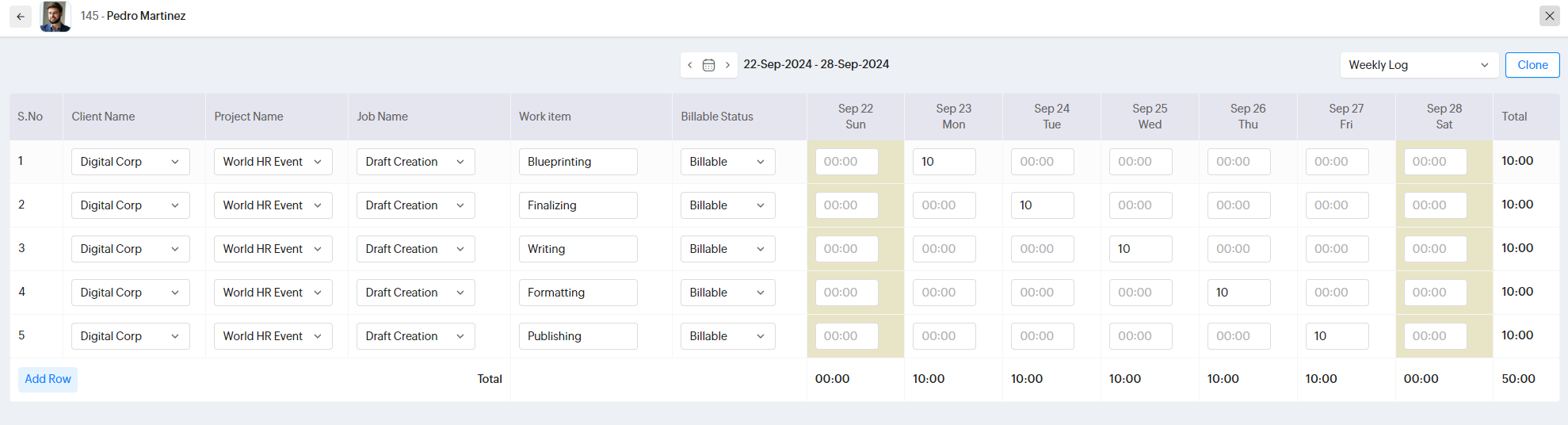 工数の記録は、複製機能を使って複製できます。また、行を追加する機能を使用して、新しい行を追加することも可能です。