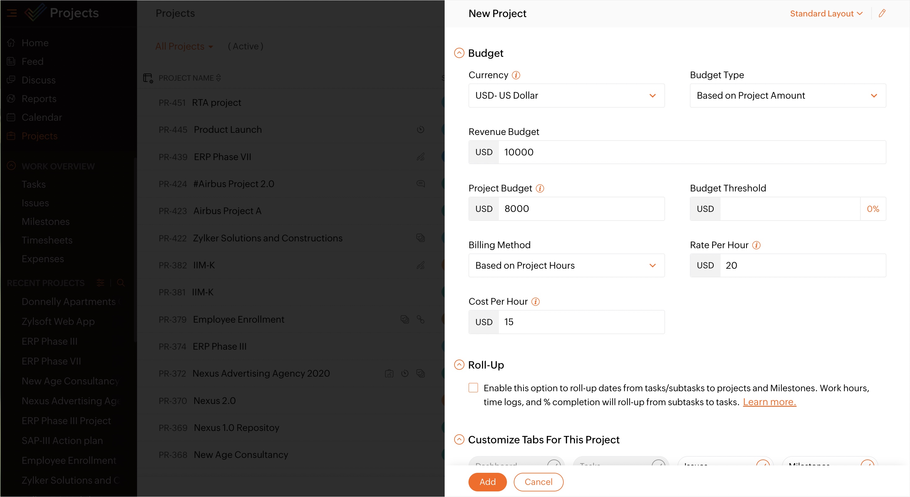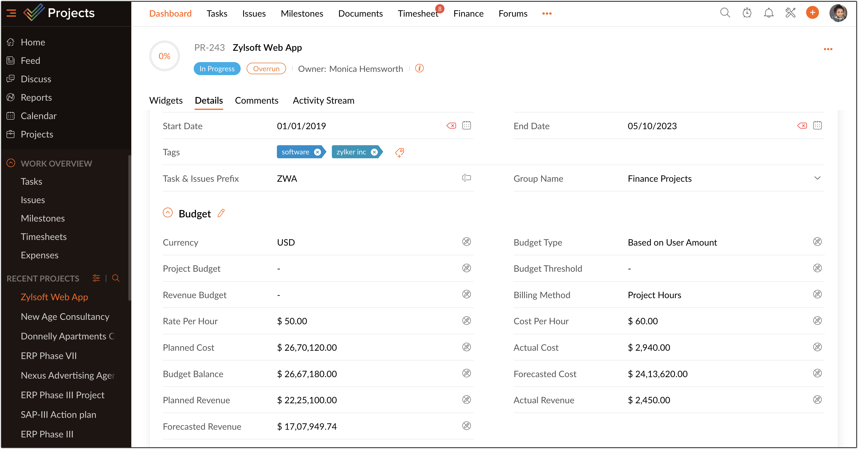 Zoho Projectsでは、プロジェクトの費用だけでなく、プロジェクトの売上も管理できます。プロジェクトの売上とは、顧客から受け取れる金額であり、プロジェクトの費用とは、プロジェクトを実施するにあたって発生するすべての経費/支出です。プロジェクトの管理者は、時間あたりのコストと時間単価(請求単価)に基づいて、プロジェクトの予算と売上を管理できます。