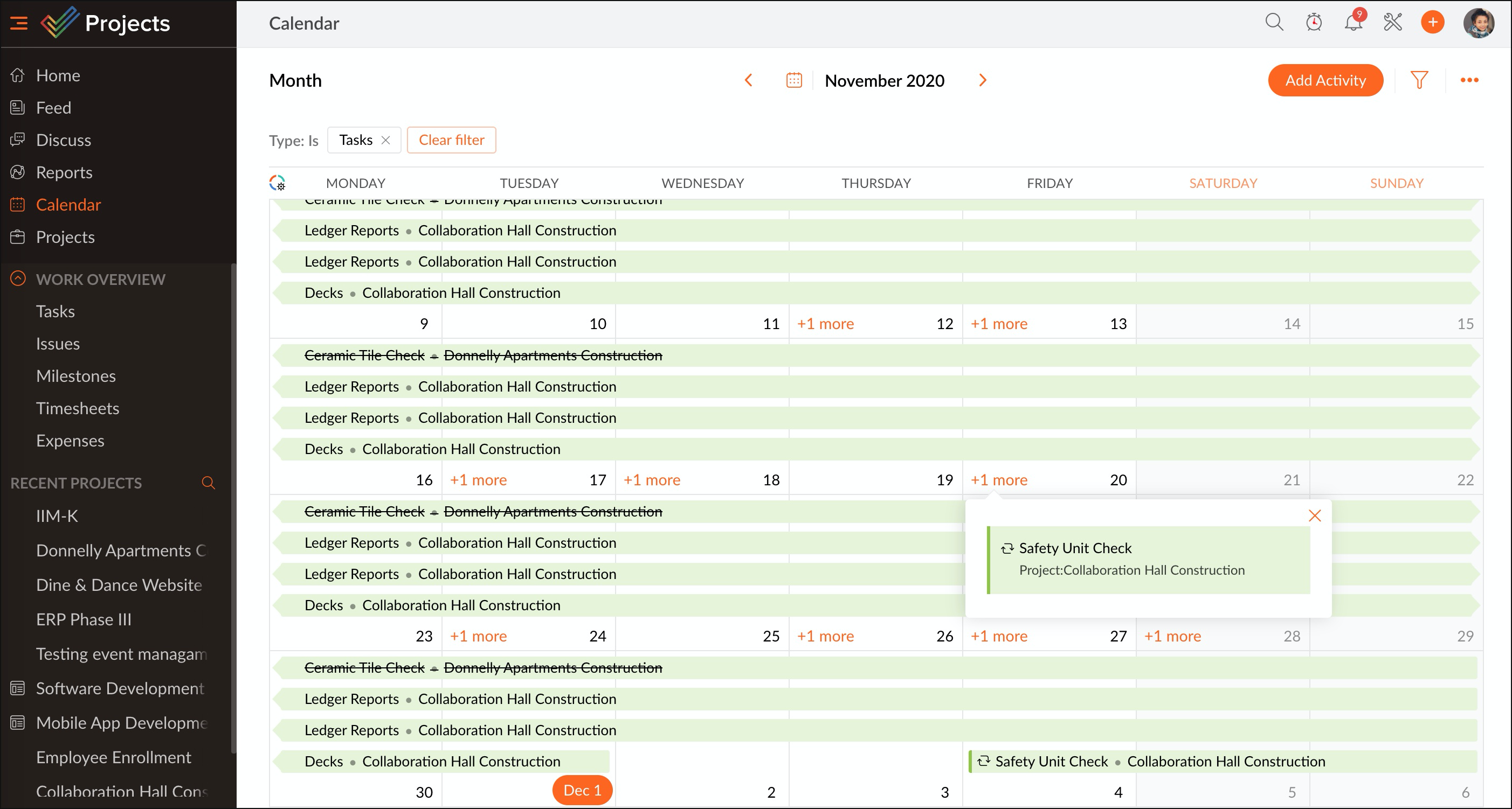 Zoho Projectsの[カレンダー]タブでは、担当者、種類、担当者と種類に基づいてデータをフィルターし、表示できます。フィルターから条件を選択すると、条件に一致するデータを表示できます。
