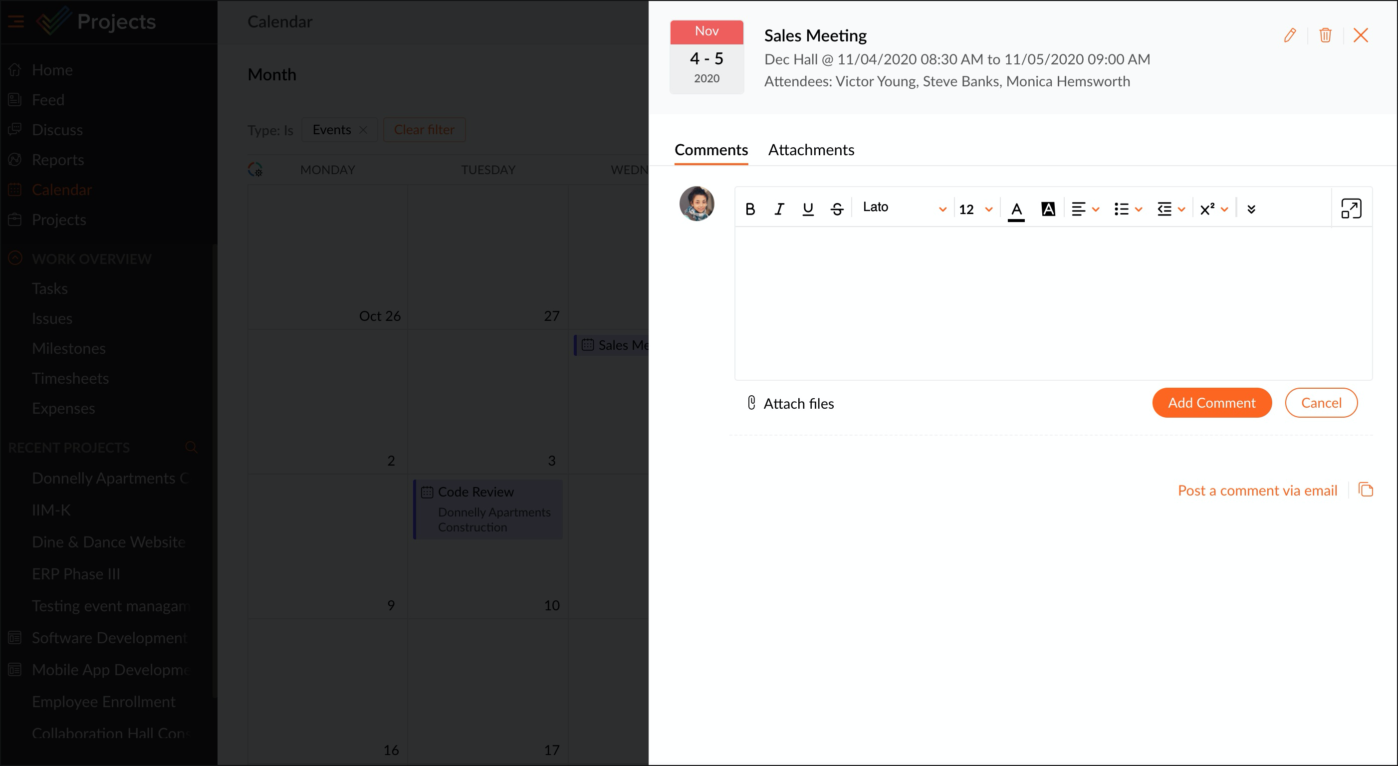 チームの予定を登録することで、プロジェクトのステータス管理に役立ちます。たとえば、あるマイルストーンに取り組んでいて、完了したタスク数や遅延しているタスク数など、マイルストーンのステータスを知りたい場合、チームミーティングを開いて状況を確認する必要があります。カレンダービューを用いて業務を行えば、カレンダー内で直接予定を登録できます。