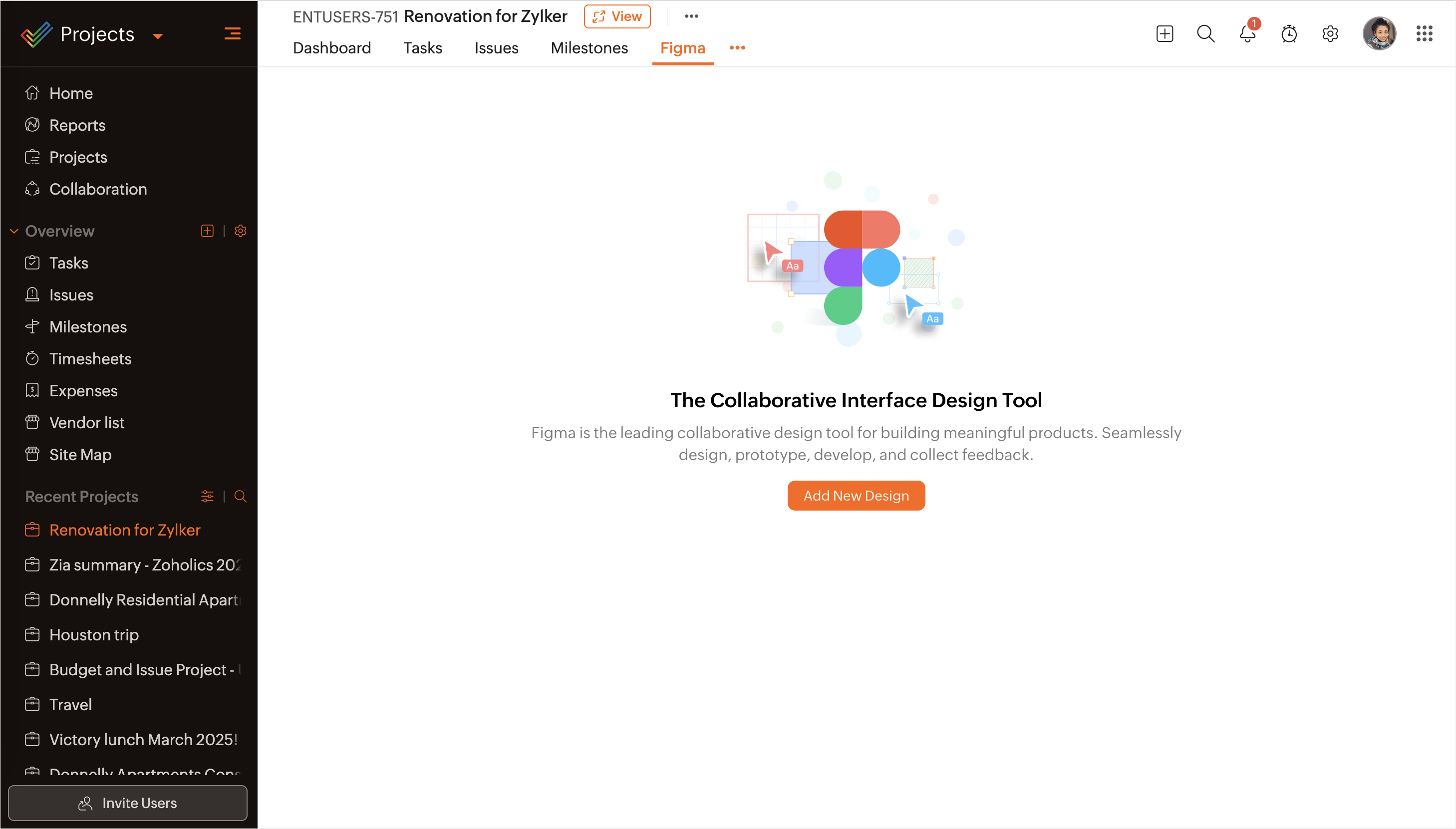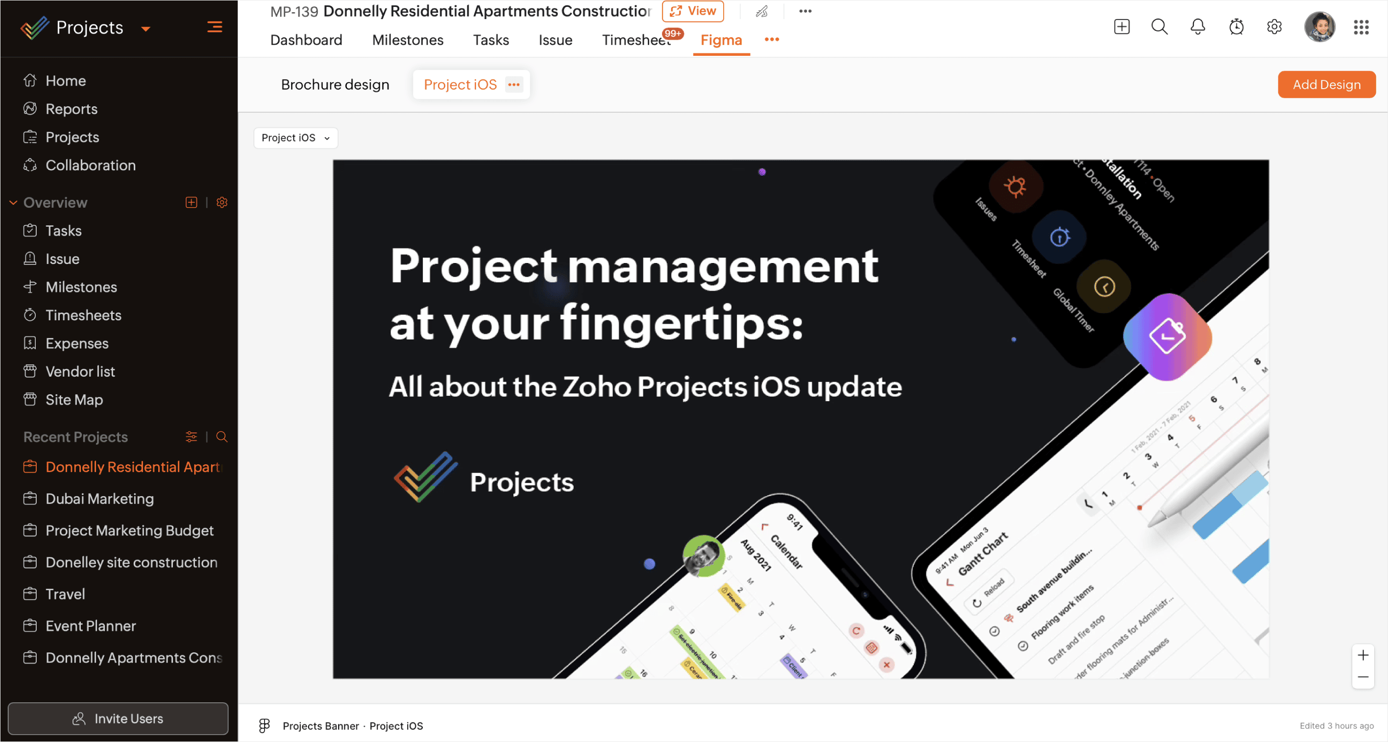 Zoho Projects Figma拡張機能を利用すると、チームはデザインファイルを直接プロジェクトに取り込むことができます。Figmaデザインは、デザイナーや関係者がコンテキスト内で閲覧・議論できるため、部門横断的な表示設定が強化され、確認するプロセスが円滑になります。これにより、デザインとプロジェクト管理が常に整合し、試作の繰り返しや最終デザインのプレゼンテーション時にも一貫性が保たれます。