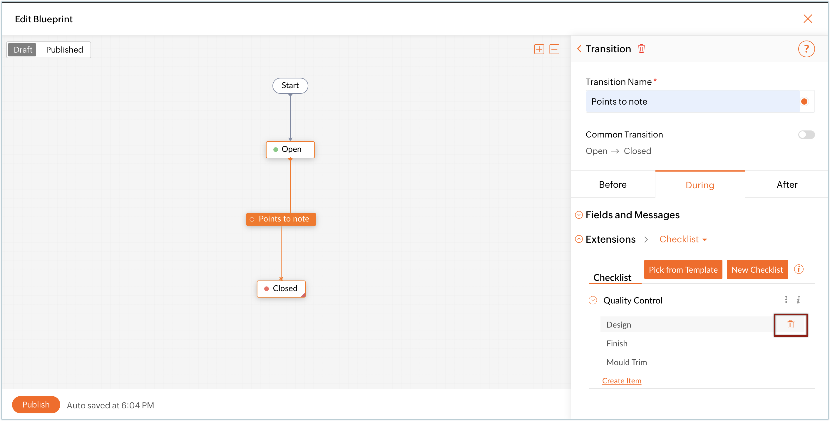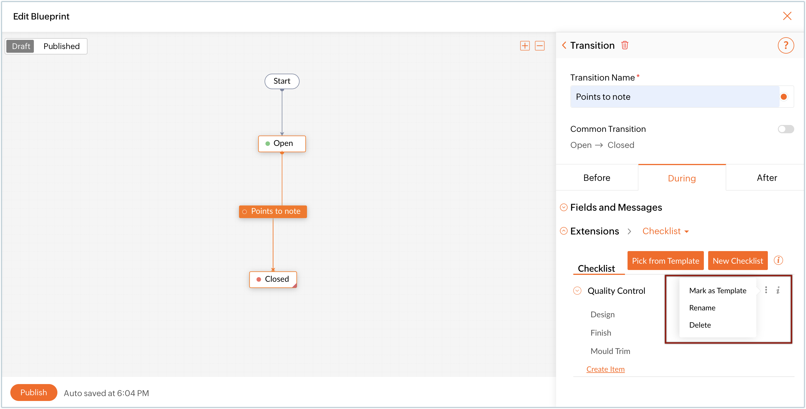 また、作成したチェックリストを、ブループリントの遷移において表示して利用することも可能です。これにより、タスクのステータスを次に進めようとしたユーザーに対してチェックリストを表示して、内容をすべて完了したら次に進められるようにするといった設定が可能になります。