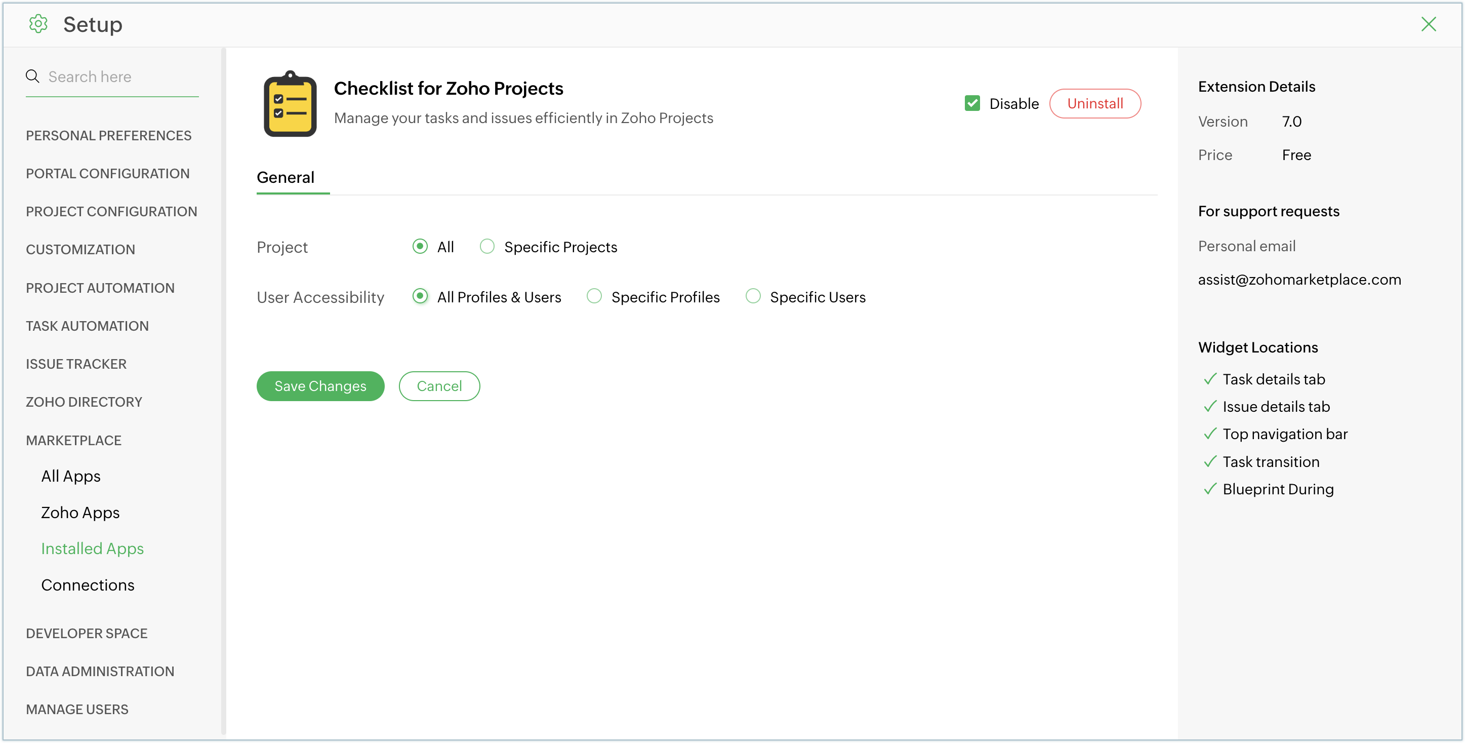 Zoho ProjectsのChecklist拡張機能は、Zoho Projectsの設定画面、またはZoho Marketplaceからインストールできます。