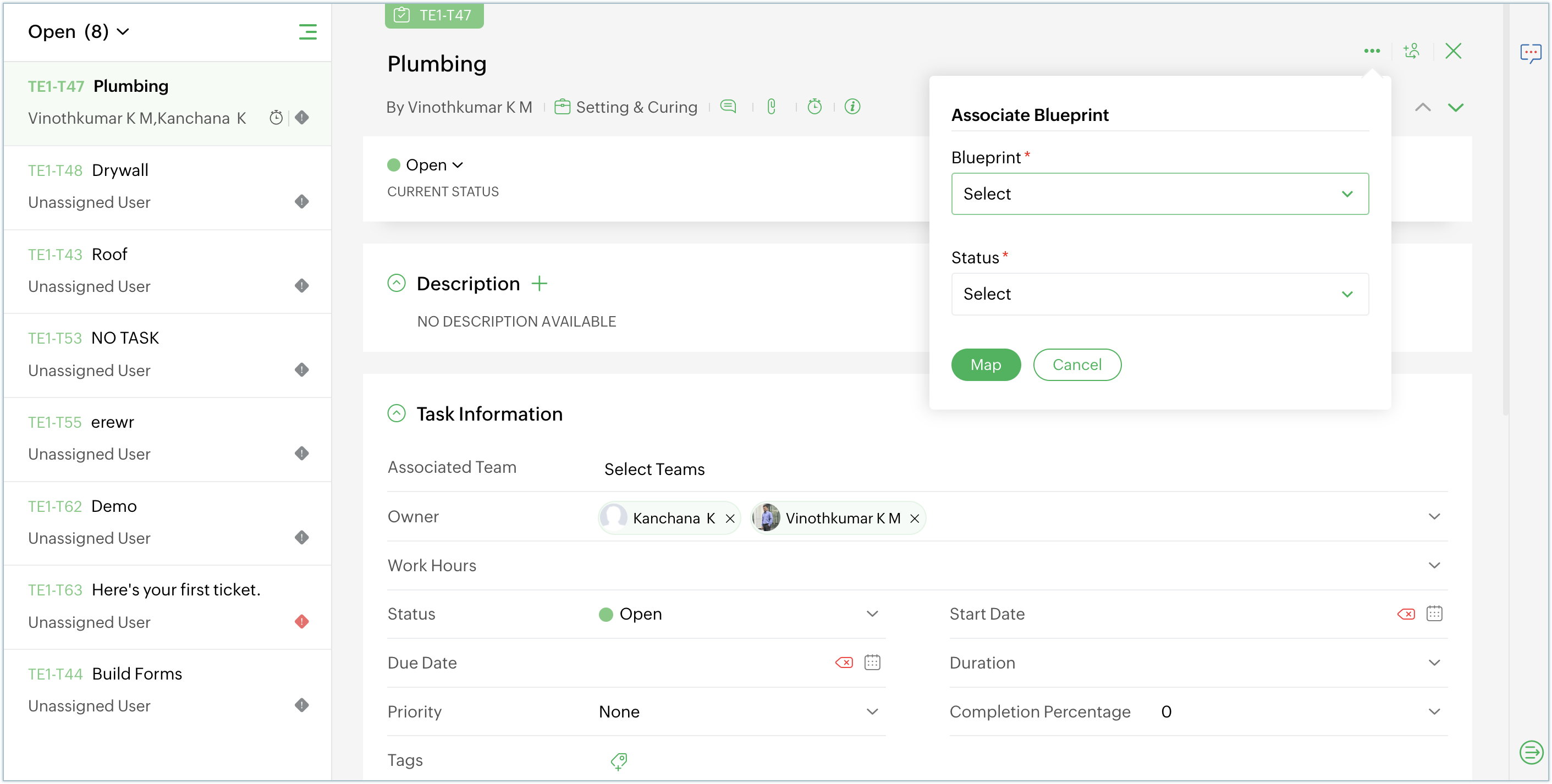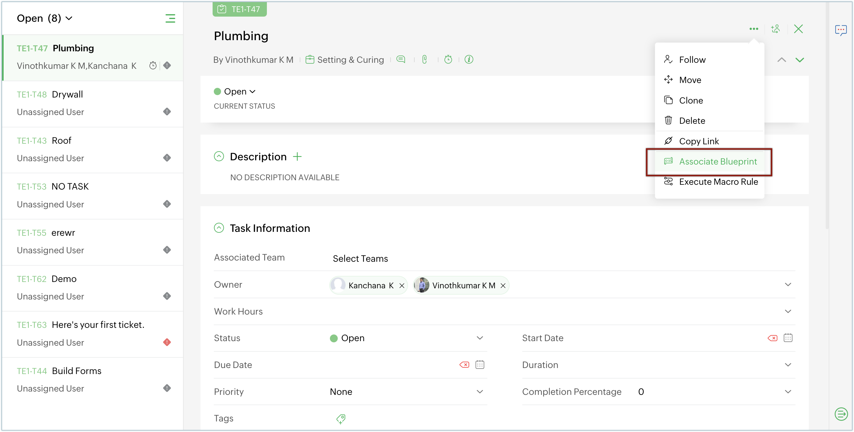 ブループリントを既存のタスクに適用するには、対象のタスクに対して該当のブループリントを関連付ける操作を行う必要があります。また、既存のタスクに対する適用(関連付け)は、手動で個別に行う必要があります。