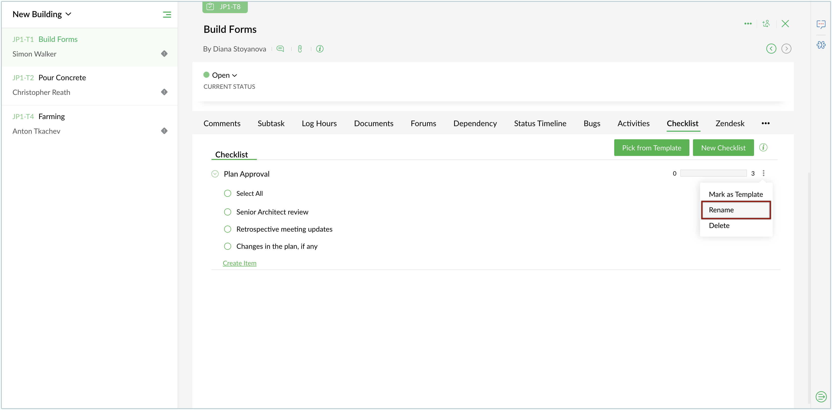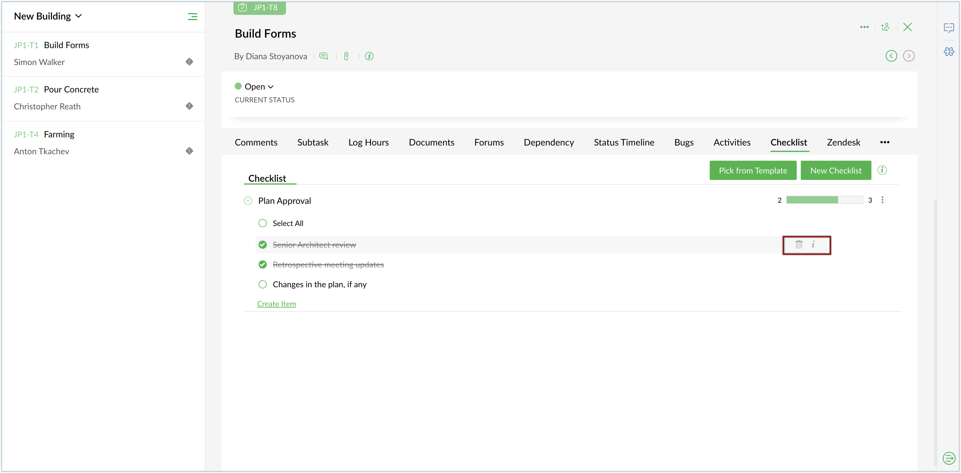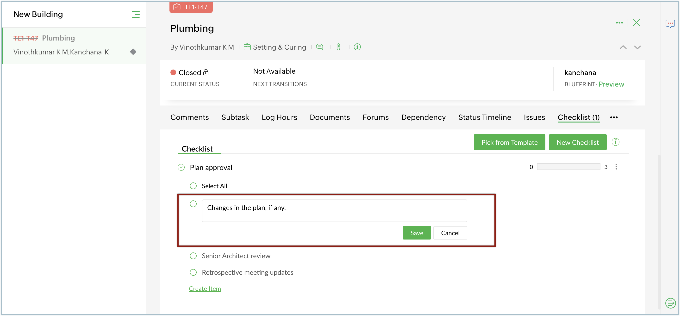 4. チェックリストに関連付けられている特定の作業項目を編集するには、作業項目にマウスのカーソルを合わせて、一回クリックします。編集が有効になります。