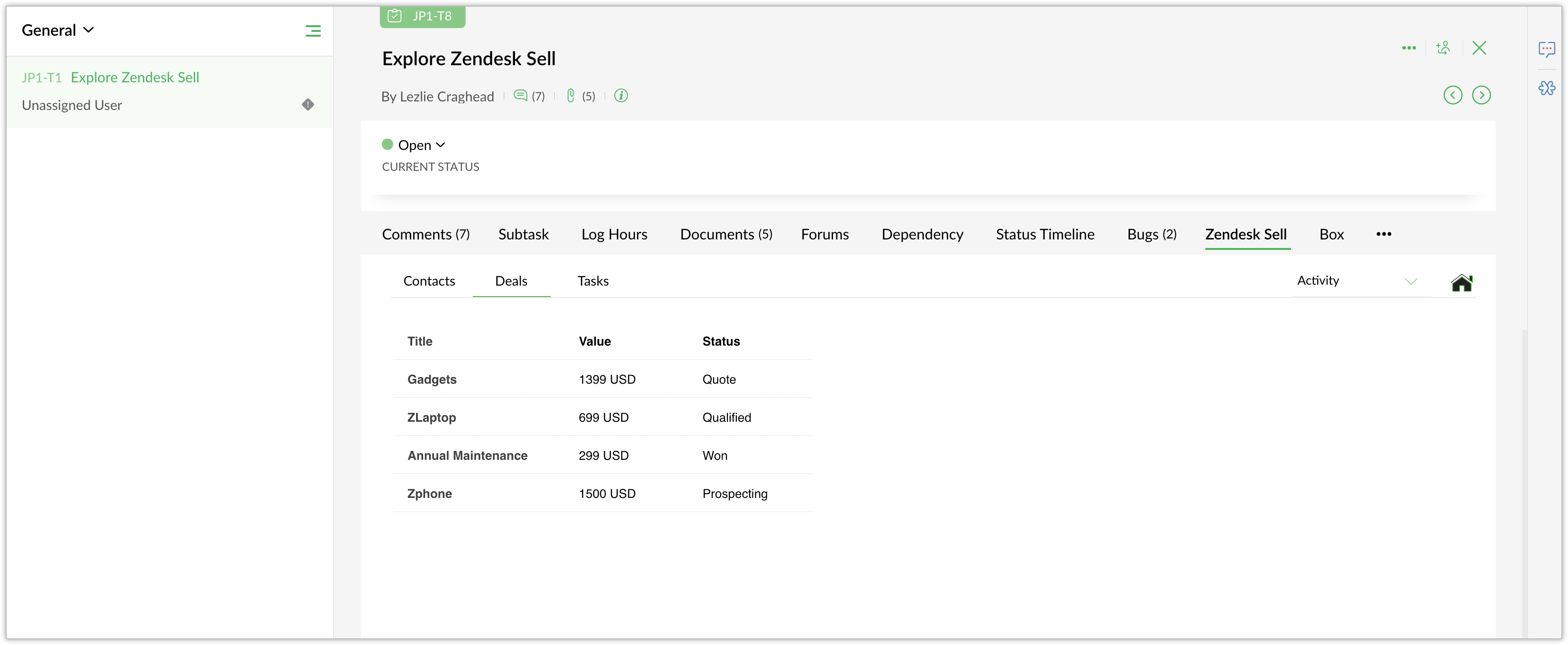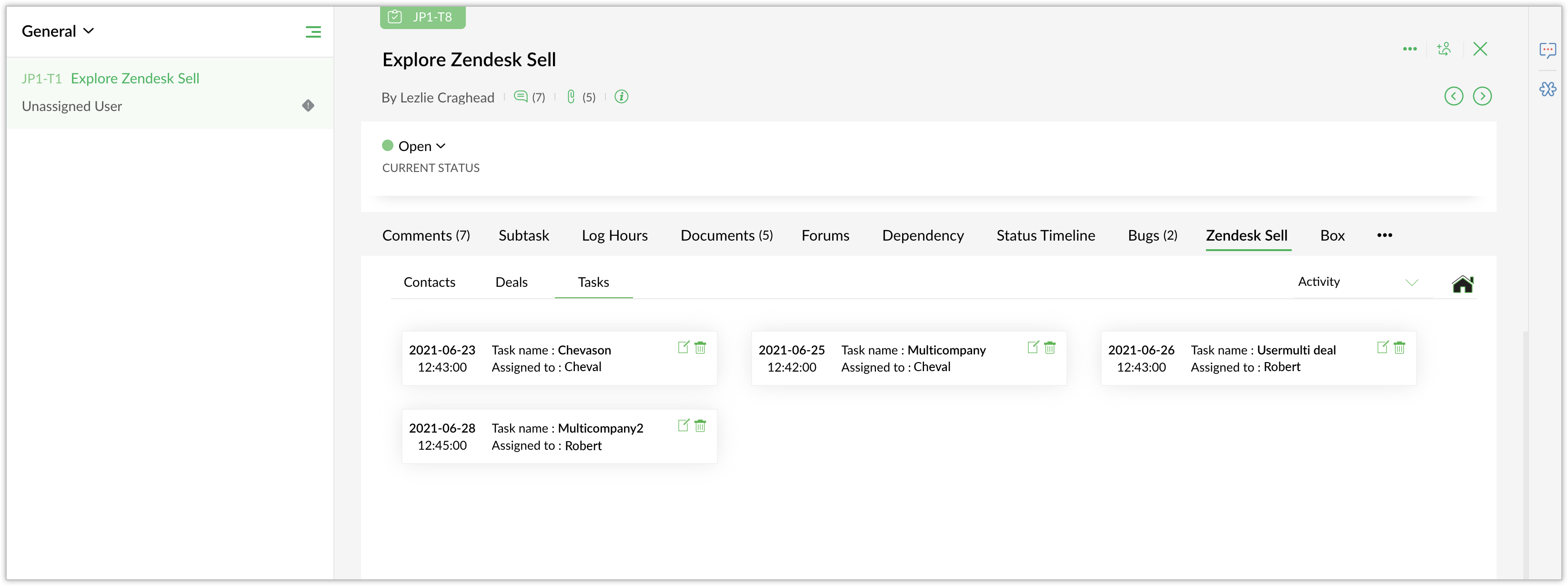 Zoho ProjectsのZendesk Sell拡張機能を使用すると、顧客の詳細を簡単に管理でき、Zoho Projectsのタスクに優先度を付けることができます。2つのアプリケーション内の連絡先、商談、タスクをまとめて管理できます。Zoho Projectsから直接、Zendesk Sell内のすべての情報を確認できます。