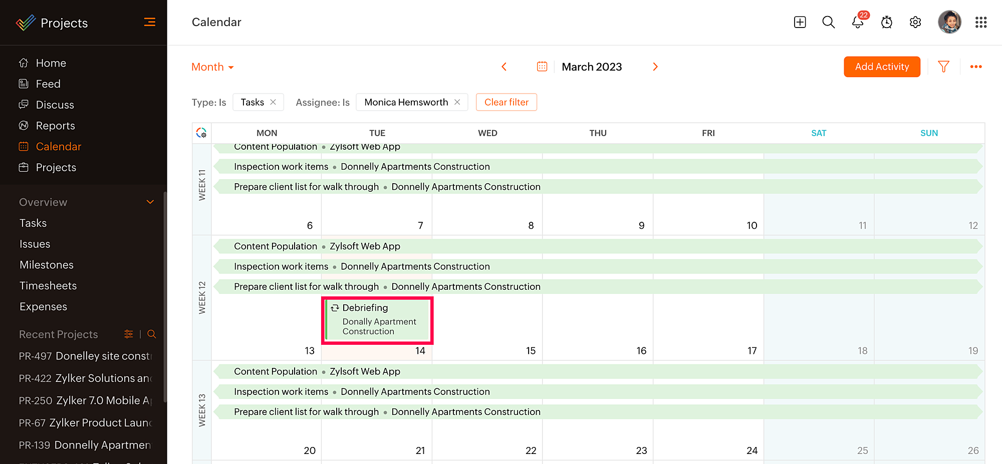 カレンダータブで定期的なタスクは、プロジェクトでアクティブのものだけが表示されます。カレンダー。定期的アイコンが付いたタスクが示されます - .