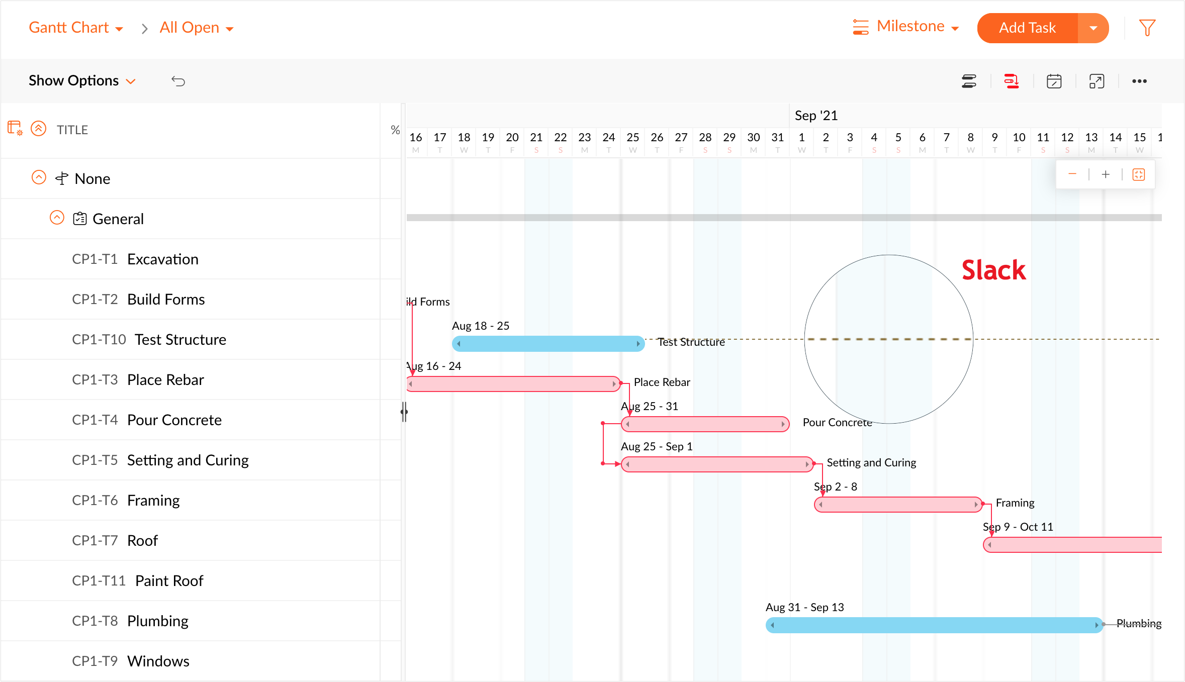 余裕時間とは、プロジェクト全体の進捗に影響しない範囲で個別のタスクに許容される遅延期間です。余裕時間の範囲までは、タスクの期限を過ぎても、プロジェクト全体の完了は遅延しません。ガントチャート上では、余裕時間は、点線で表示されます。また、余裕時間のあるタスクは、クリティカルパス上のタスクとは見なされません(クリティカルパスには含まれません)。