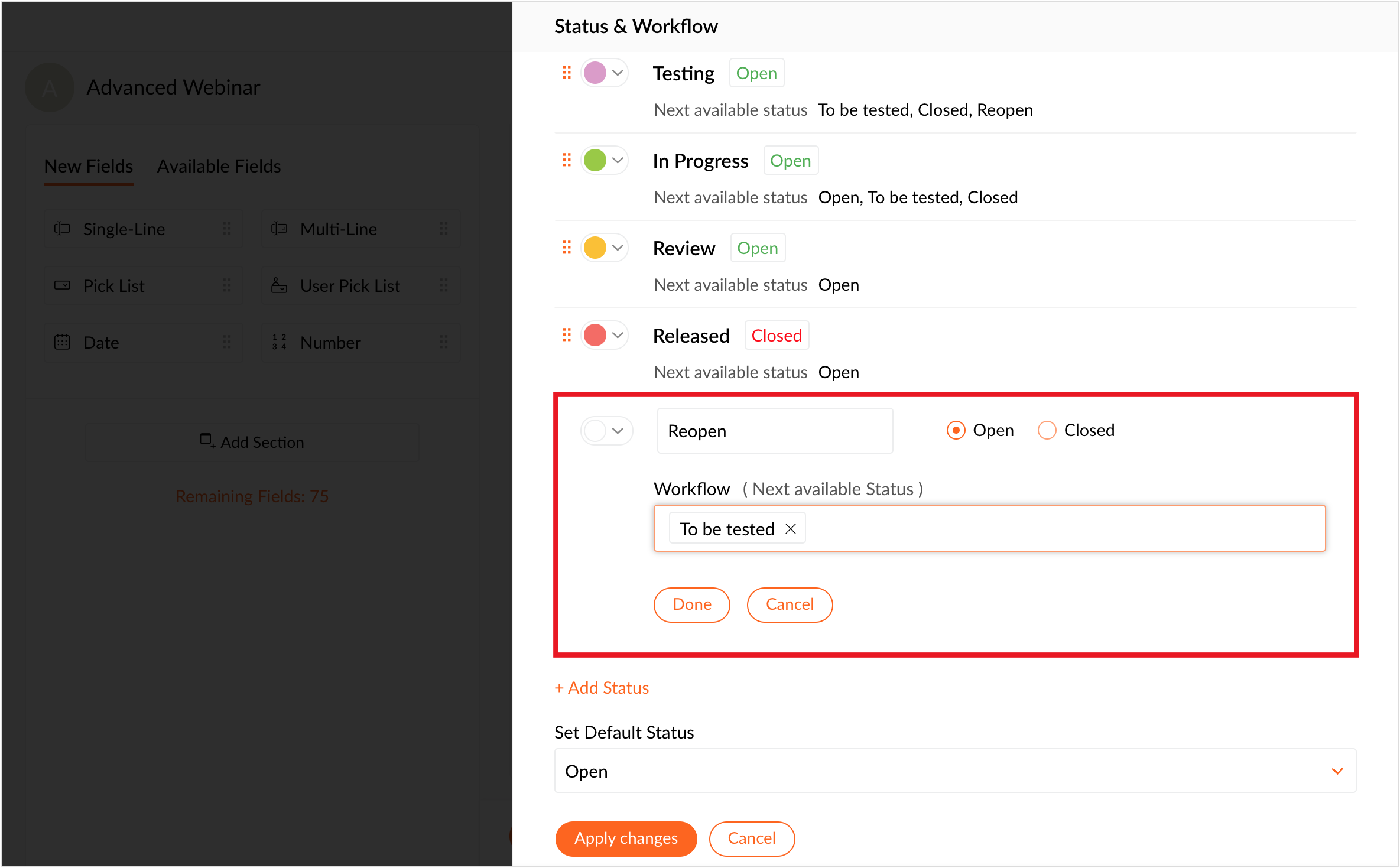 - 変更する初期設定ステータスセクションの下で、問題のデフォルトステータス。