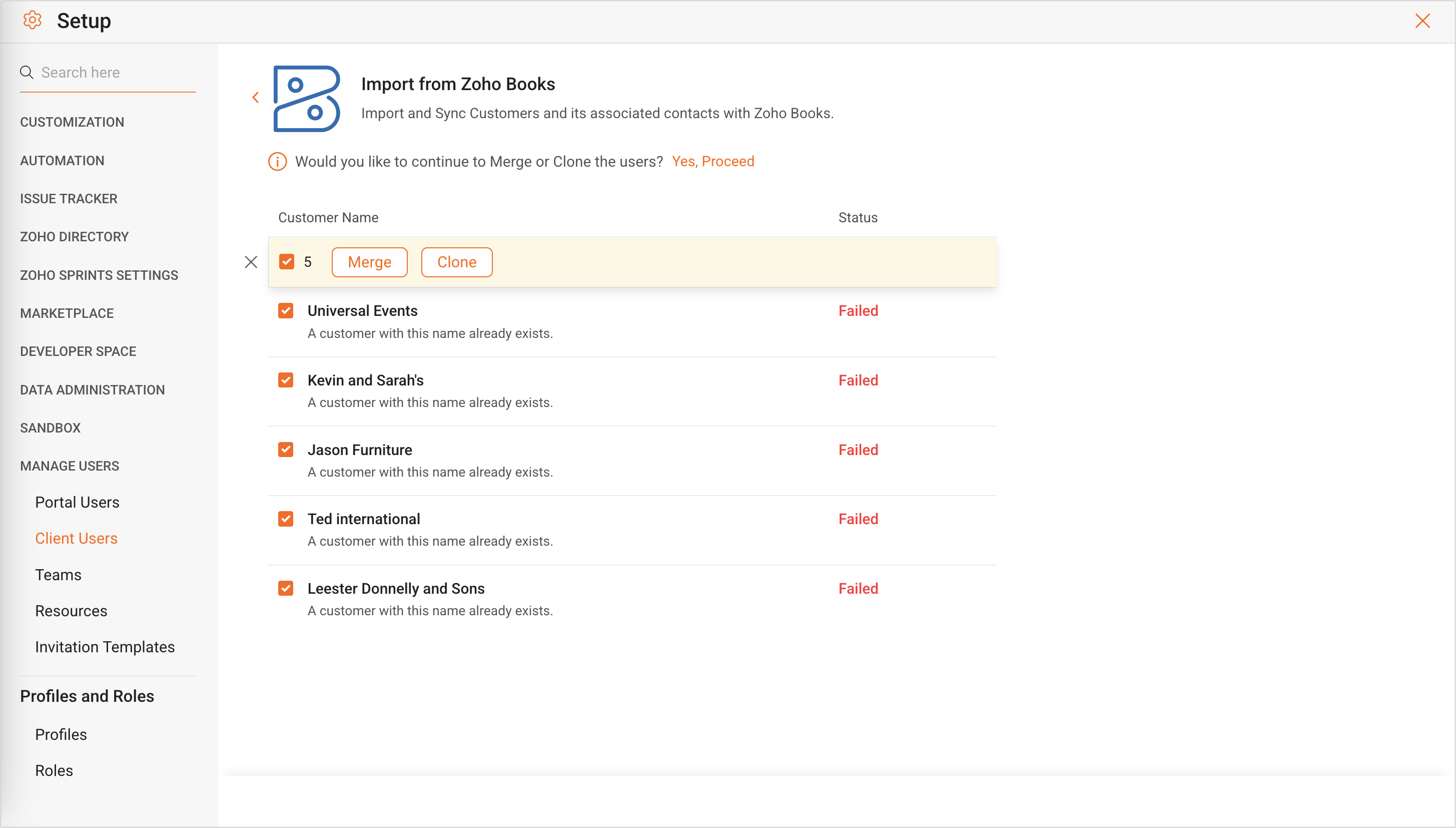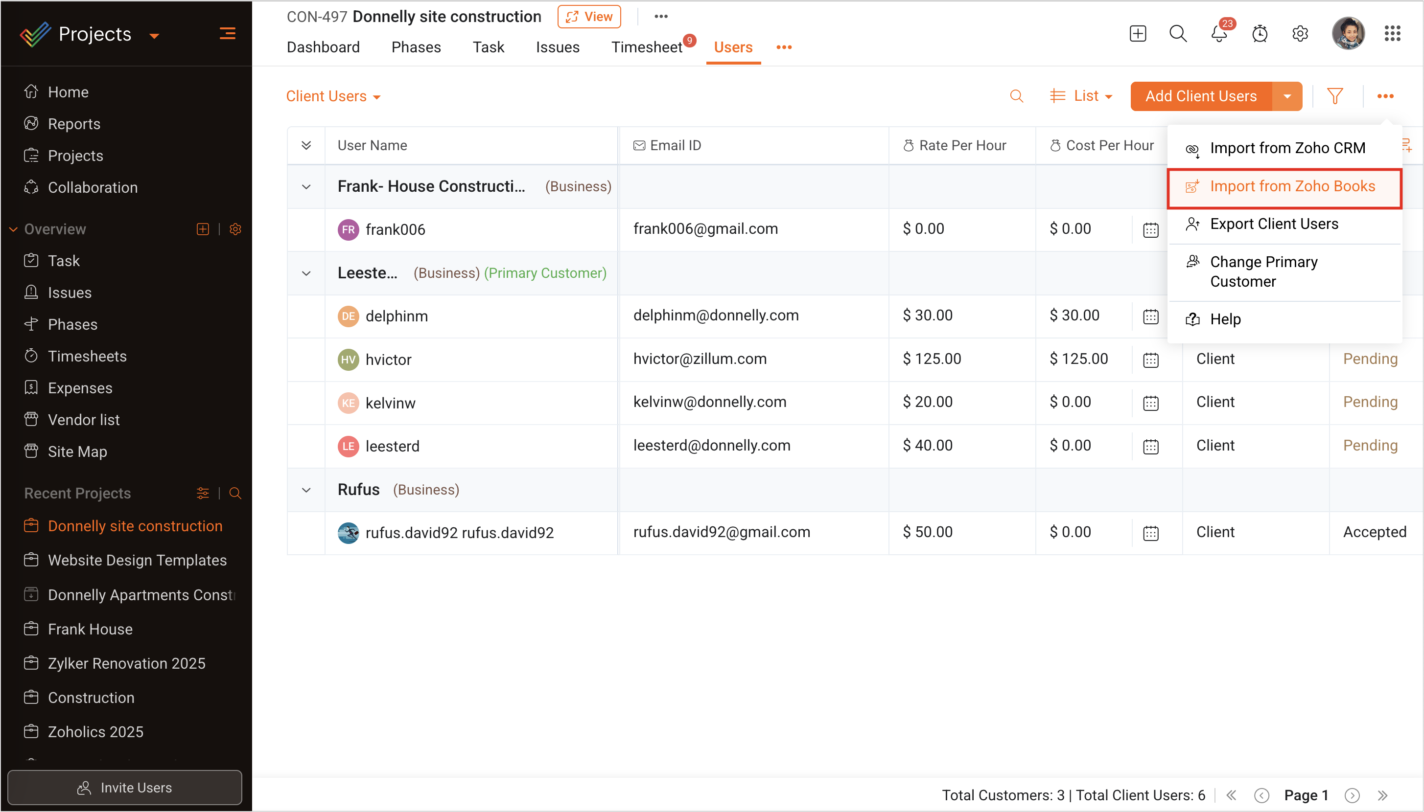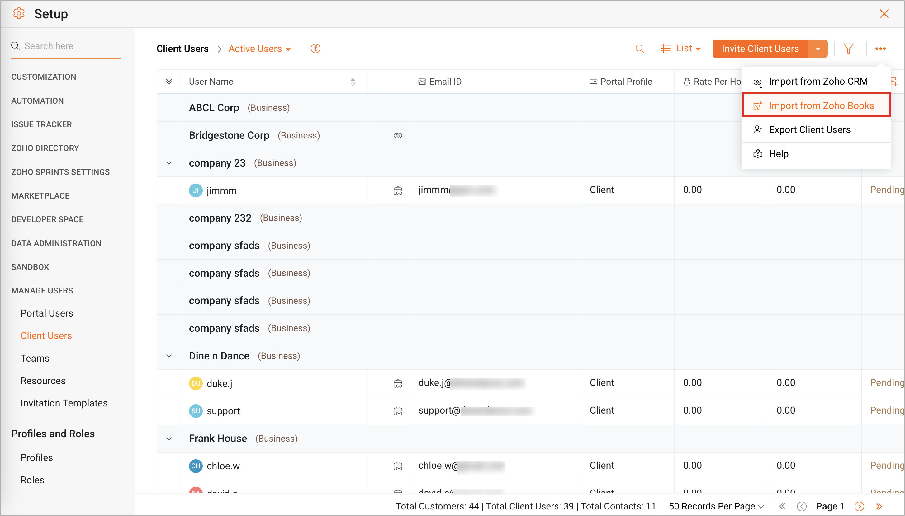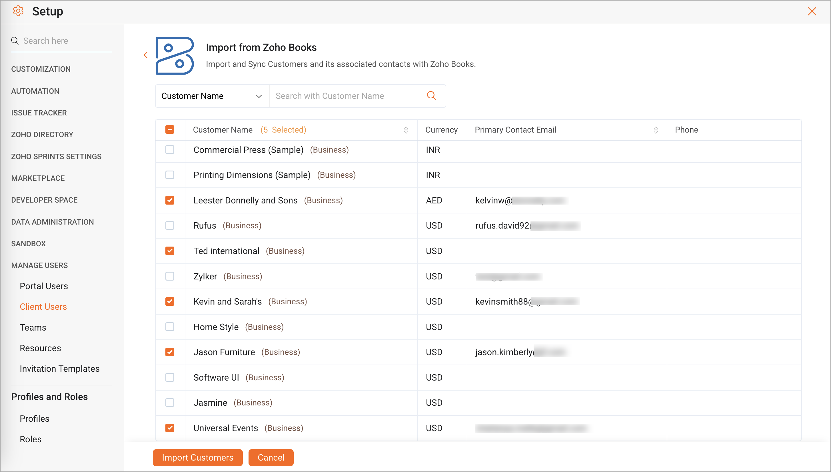 Finance権限およびClient権限を持つユーザーは、Zoho Finance Suiteアプリ(Zoho BooksおよびZoho Invoice)から直接顧客をインポートできます。この操作は組織レベルまたはプロジェクト内で実行できます。顧客とともに、関連付けられている連絡先もインポートされます。