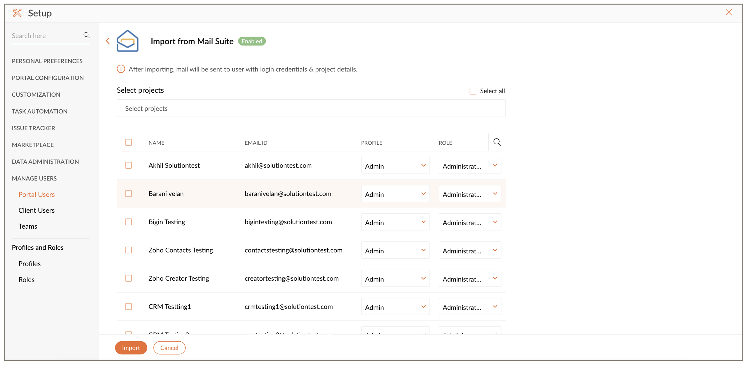 Zoho Projects では、Zoho Mailからユーザーと取引先をインポートする機能を利用できます。この機能は、Zoho CRM PlusとZoho Oneでは利用できません。