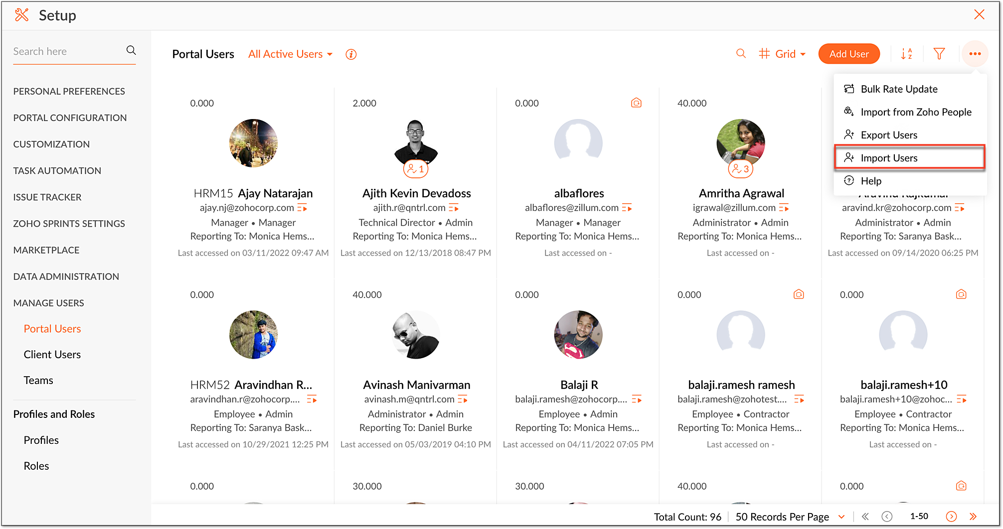 Zoho Projectsでは、CSV(コンマ区切りの値)形式のファイルからユーザーをインポートできます。CSVファイルを使用すると、Zoho Projectsポータルにユーザーを一括でインポートできます。