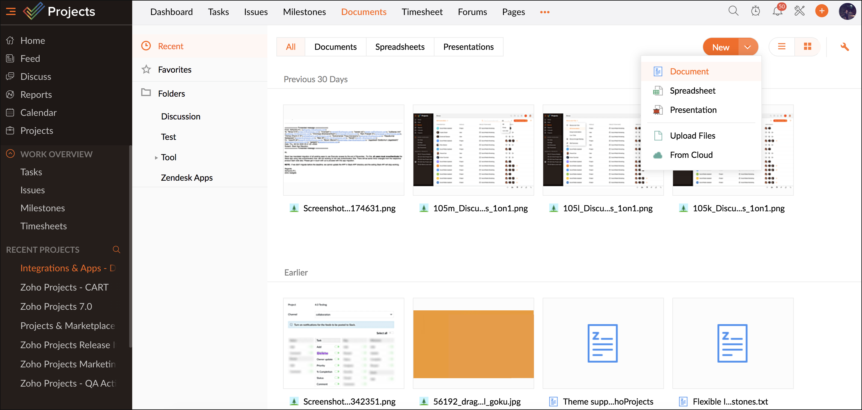 自分のデスクトップからのドキュメントの添付とは別に、Google ドキュメント、スプレッドシート、プレゼンテーションなどから、 Zoho Projects にドキュメントをアップロードできます。これにより、Google ドライブに保存したドキュメントを、プロジェクト内のすべてのユーザーに共有できます。