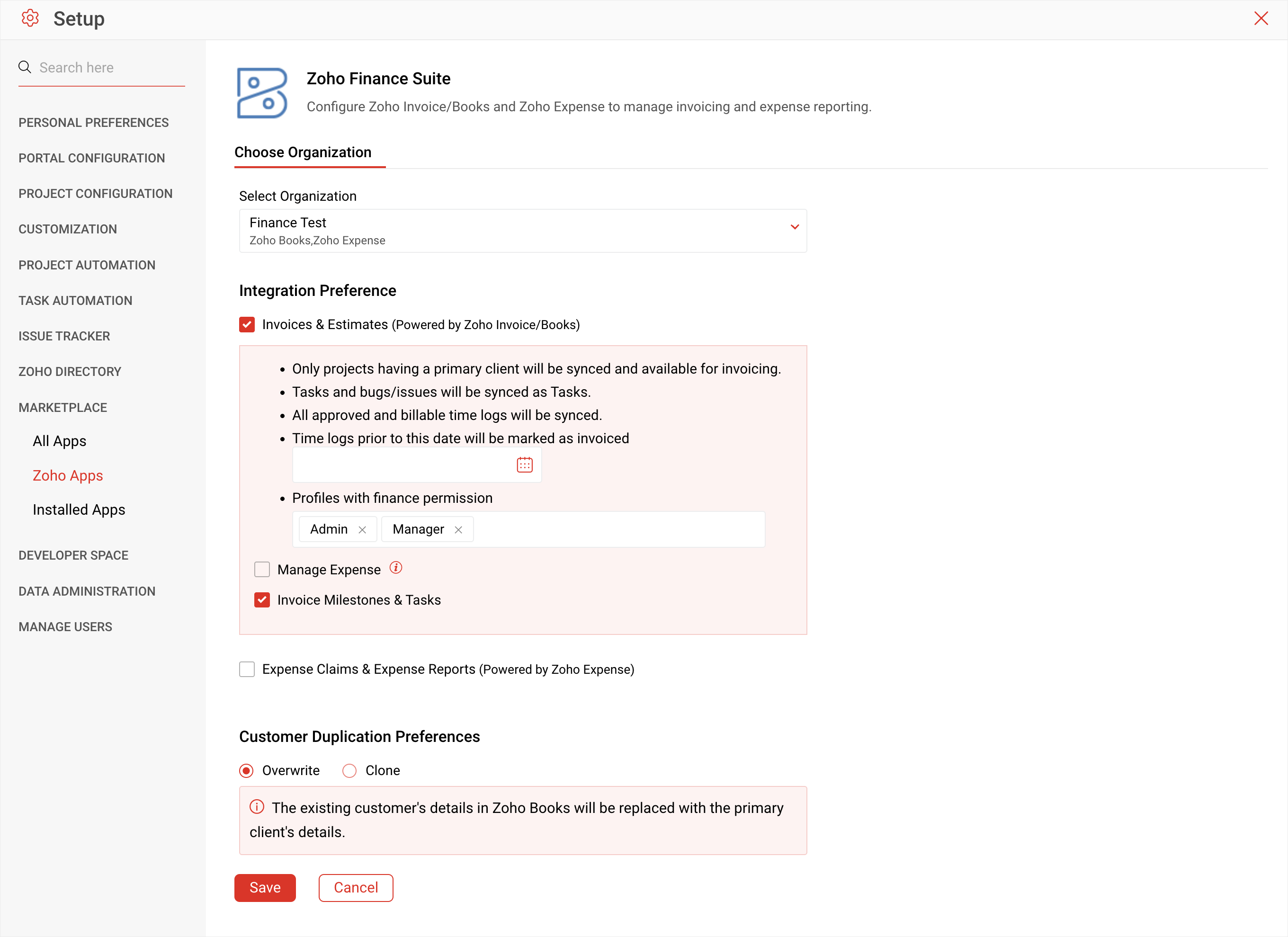 新しい連携により、Zoho Projectsのデータが、Zoho InvoiceまたはZoho Booksの工数管理タブに同期されるようになりました。Zoho Projectsの[会計]タブを介して、すべての会計関連の処理を実行できます。Zoho InvoiceまたはZoho Booksで連絡先の設定(メインのクライアントの連絡先の上書き、複製)を行うこともできます。