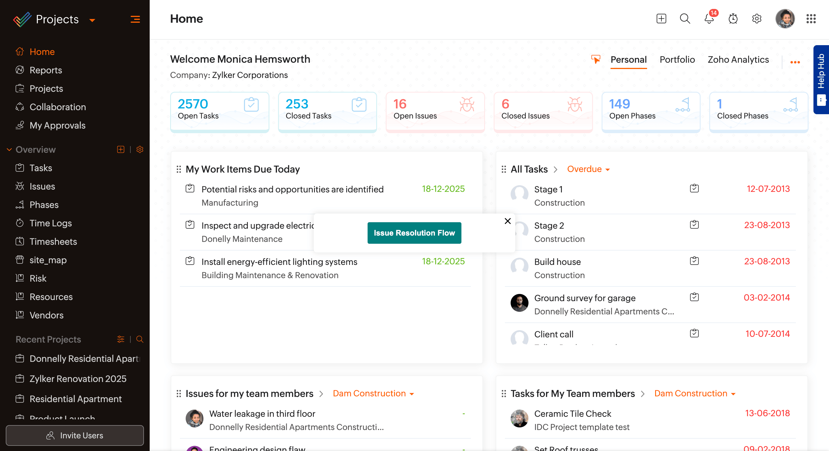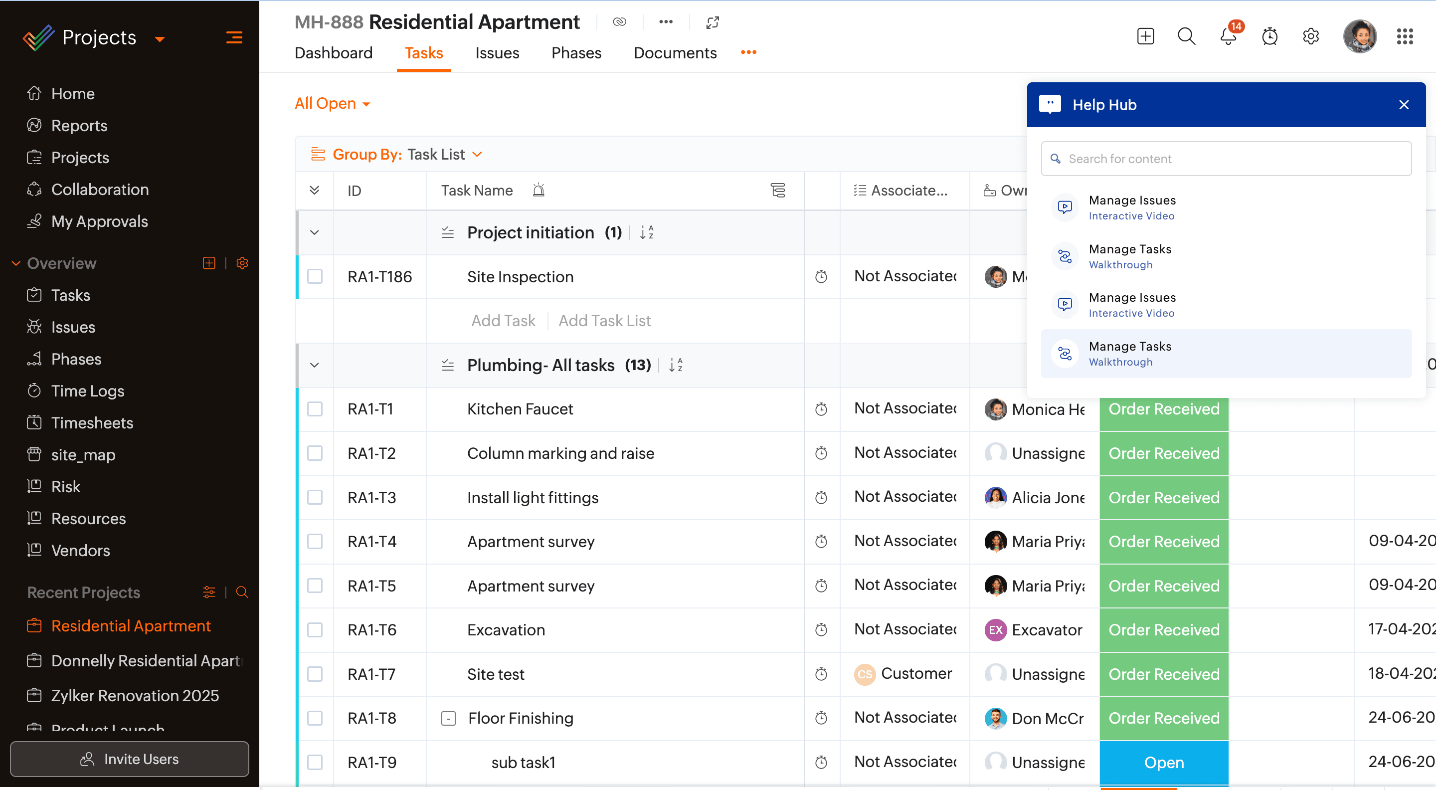 ウォークスルーは、Zoho プロジェクト内でユーザーを手順ごとのプロセスに沿って案内します。
