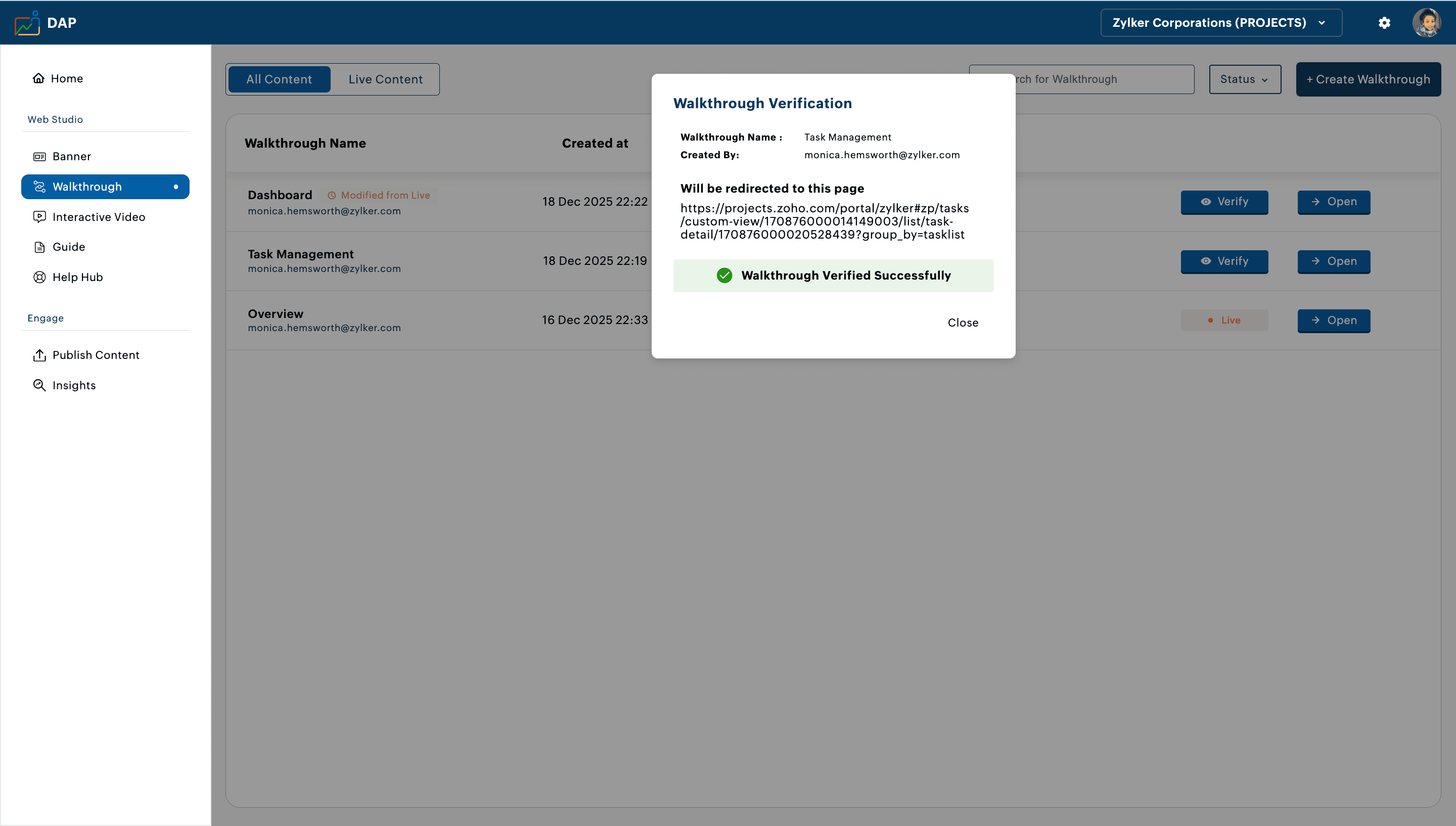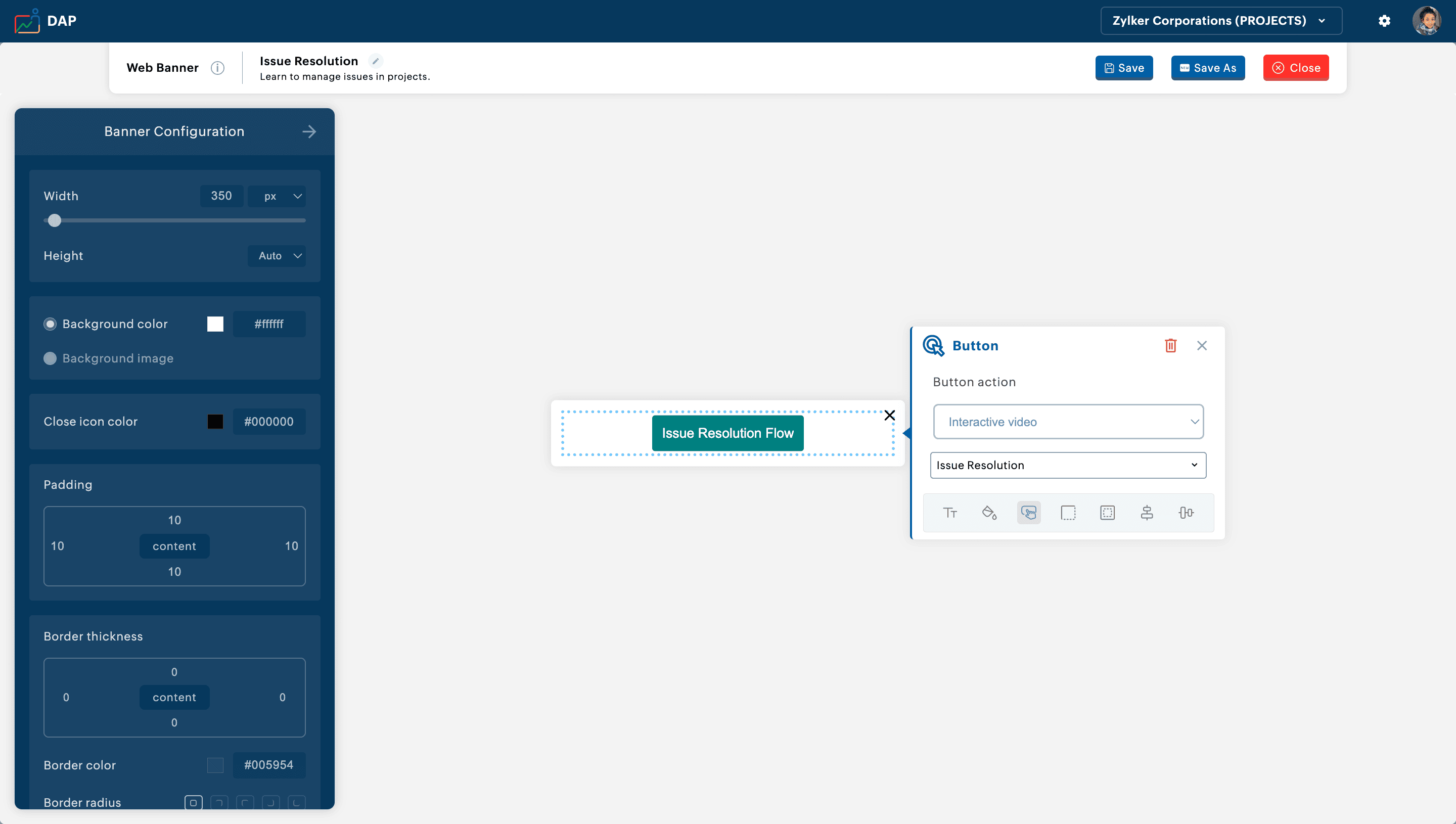 Zoho プロジェクト向け Zoho DAP を使用すると、チームは Zoho プロジェクト内に直接表示されるウォークスルー、インタラクティブ動画、ガイド、バナー、ヘルプハブを作成し、必要なタイミングでユーザーを支援できます。