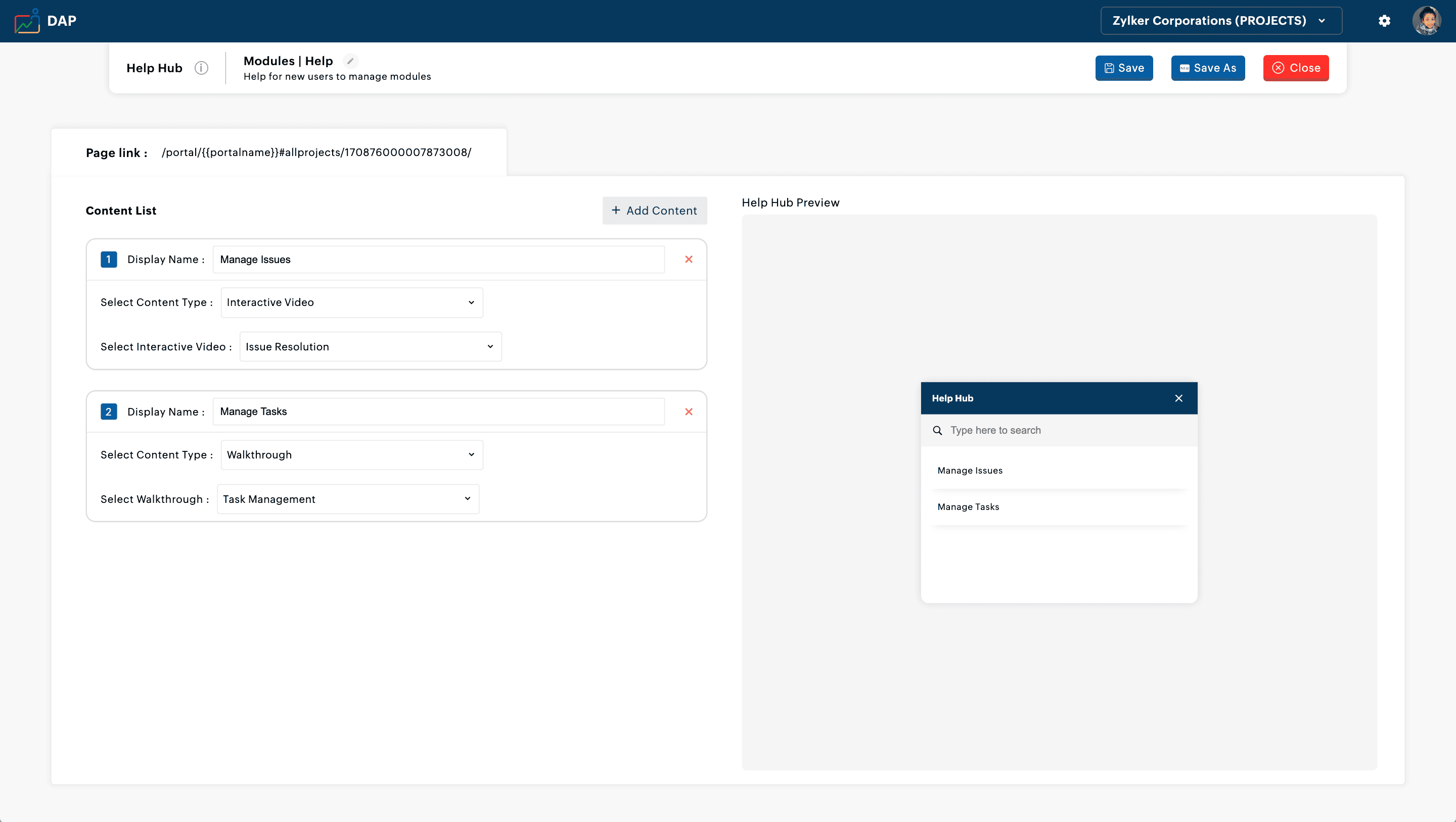 ヘルプハブを使用すると、複数の DAP コンテンツをまとめてグループ化し、Zoho プロジェクト内の 1 つのエントリポイントからアクセスできるようにできます。