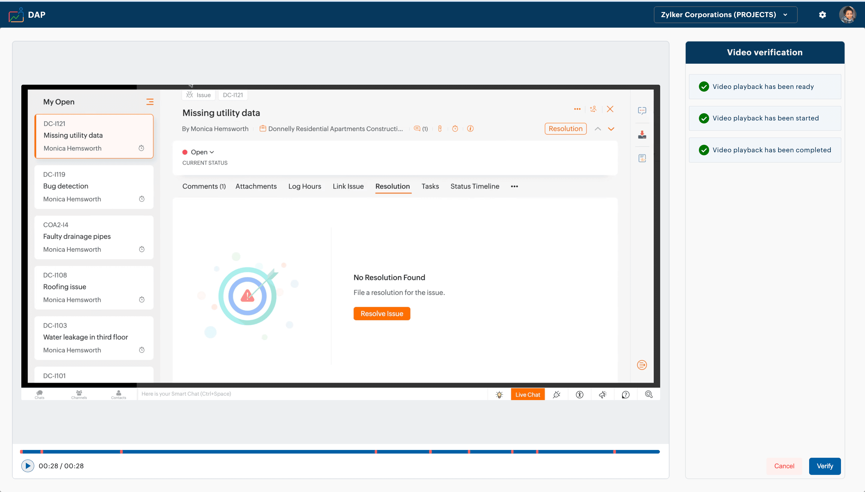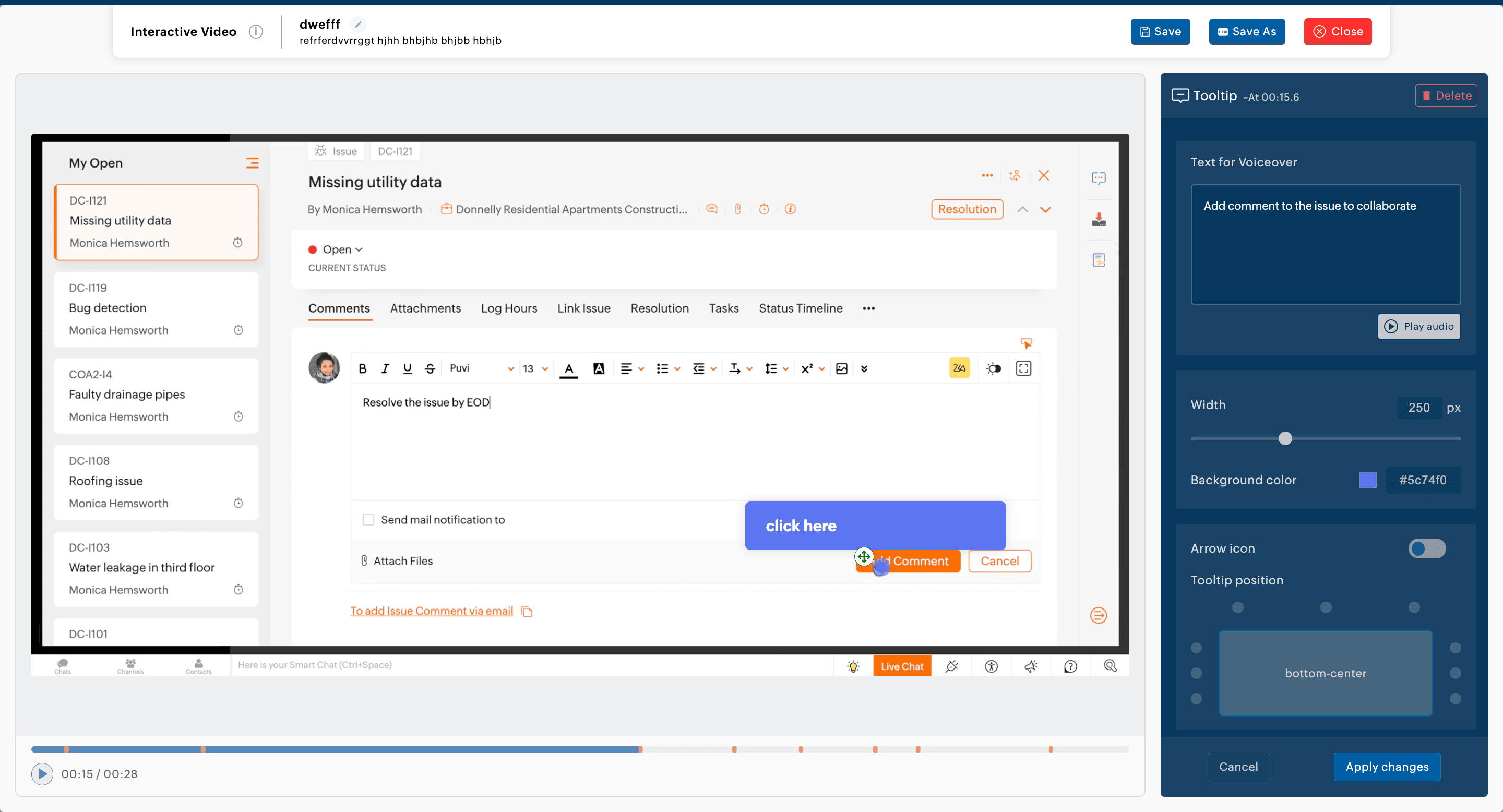 インタラクティブ動画は、Zoho プロジェクト内の実際のワークフローをキャプチャし、それを音声ガイド付きのインタラクティブな学習コンテンツに変換します。