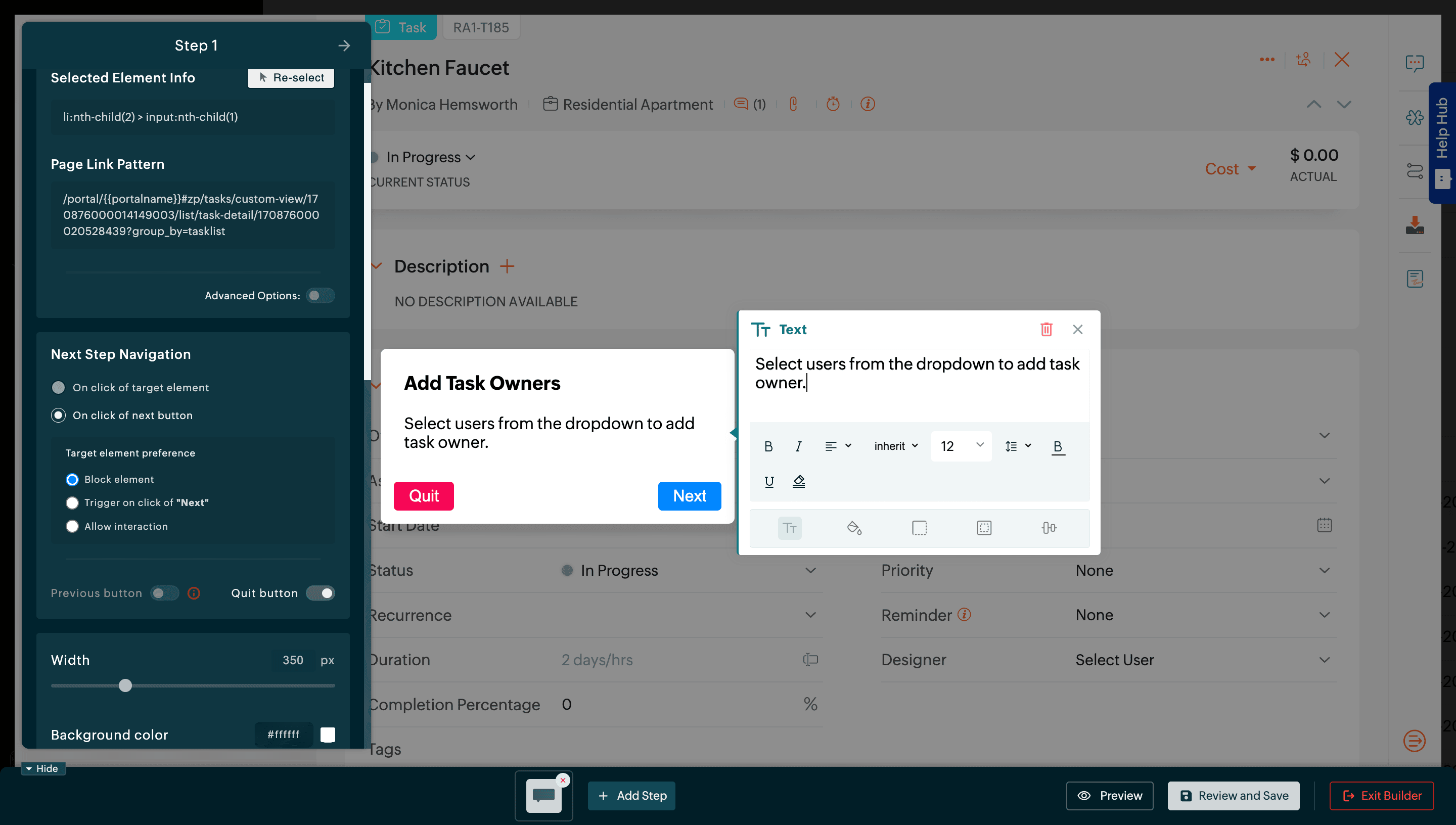 - ユーザーは右側パネルから各手順ごとにターゲット要素の設定をカスタマイズして、コンテンツを微調整できます。