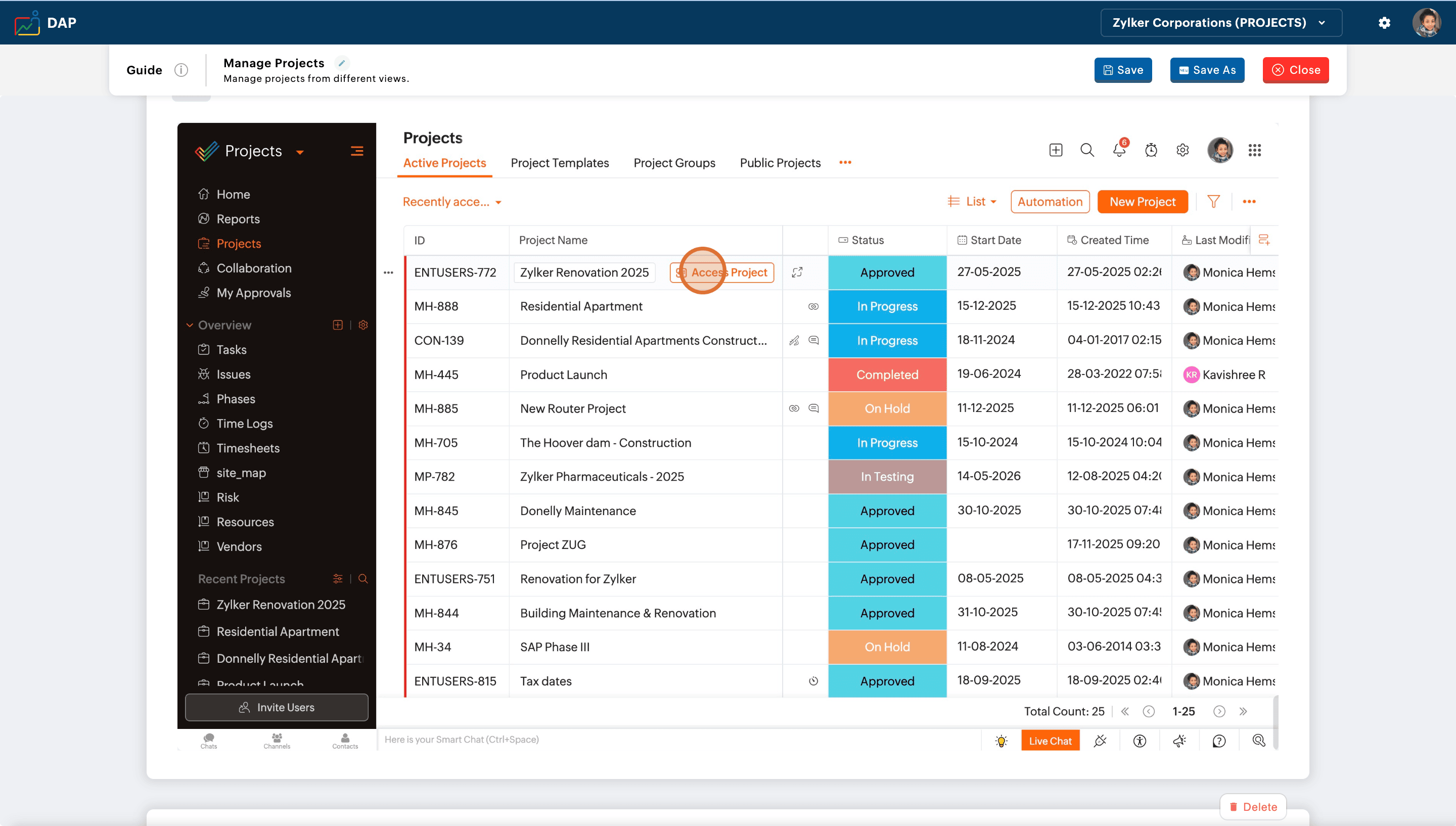 - Zoho DAP が Zoho プロジェクトにリダイレクトし、画面上の操作のキャプチャを開始します。