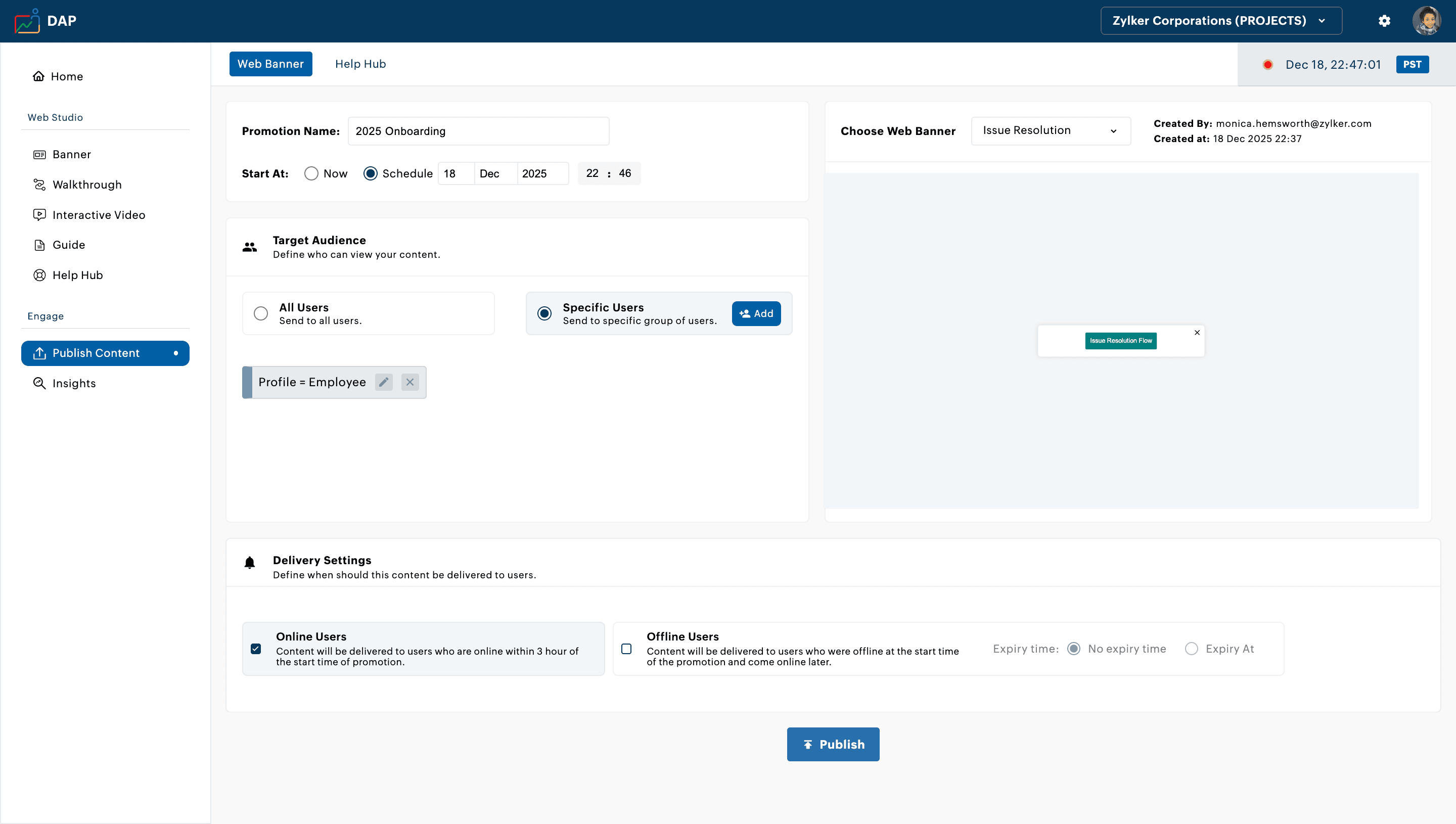 - コンテンツを配信 し、Web バナーまたはヘルプハブを通じて Zoho プロジェクト内に表示します。