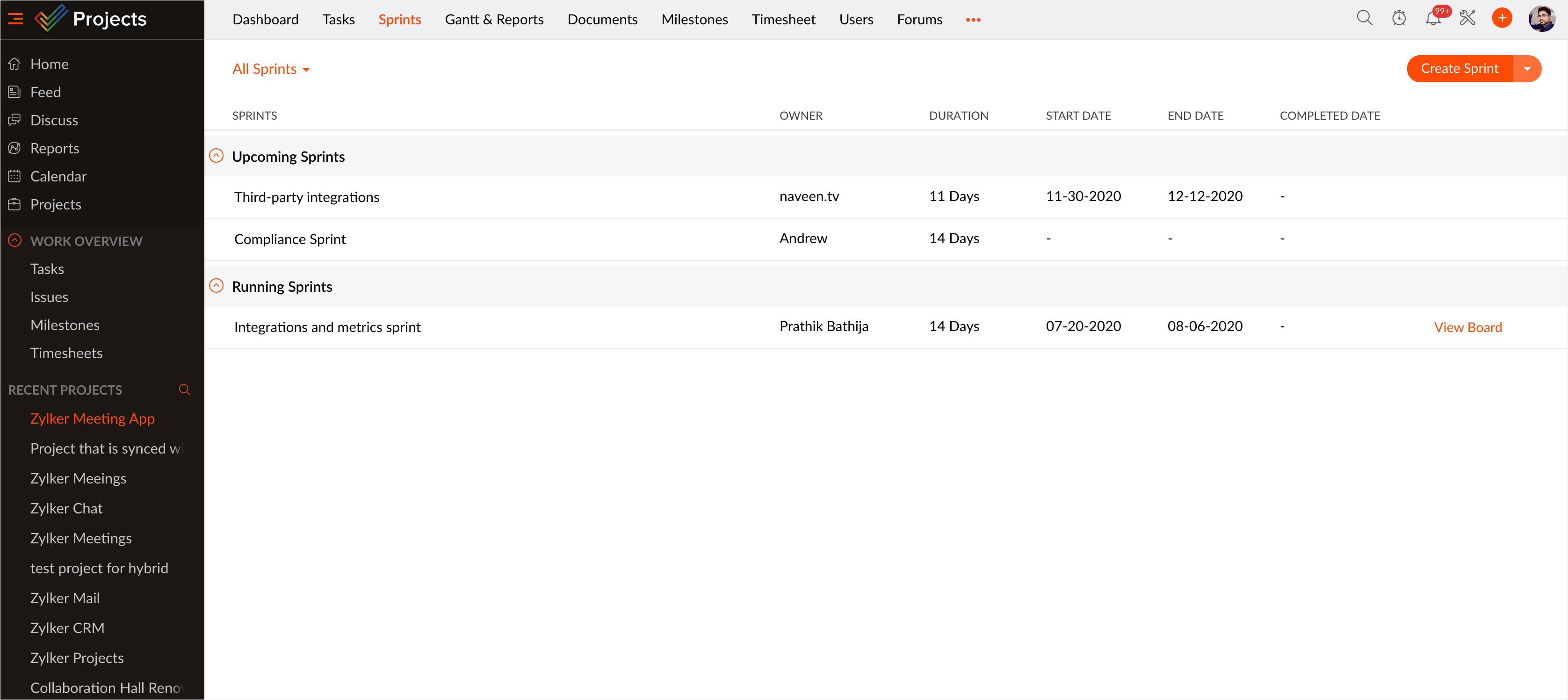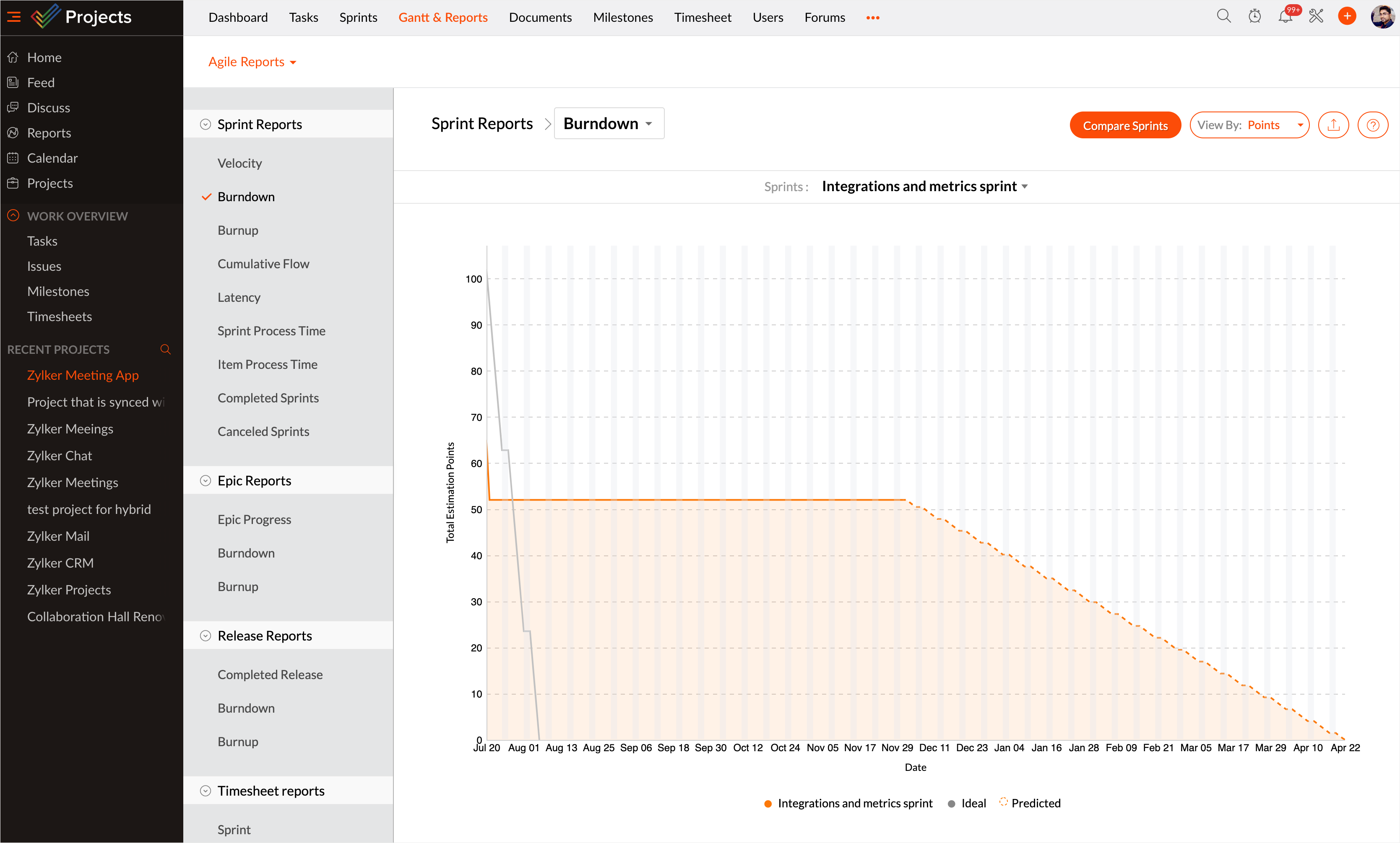 Zoho Projectsの [ガントチャートとレポート] では、スプリントのレポートを確認できます。
