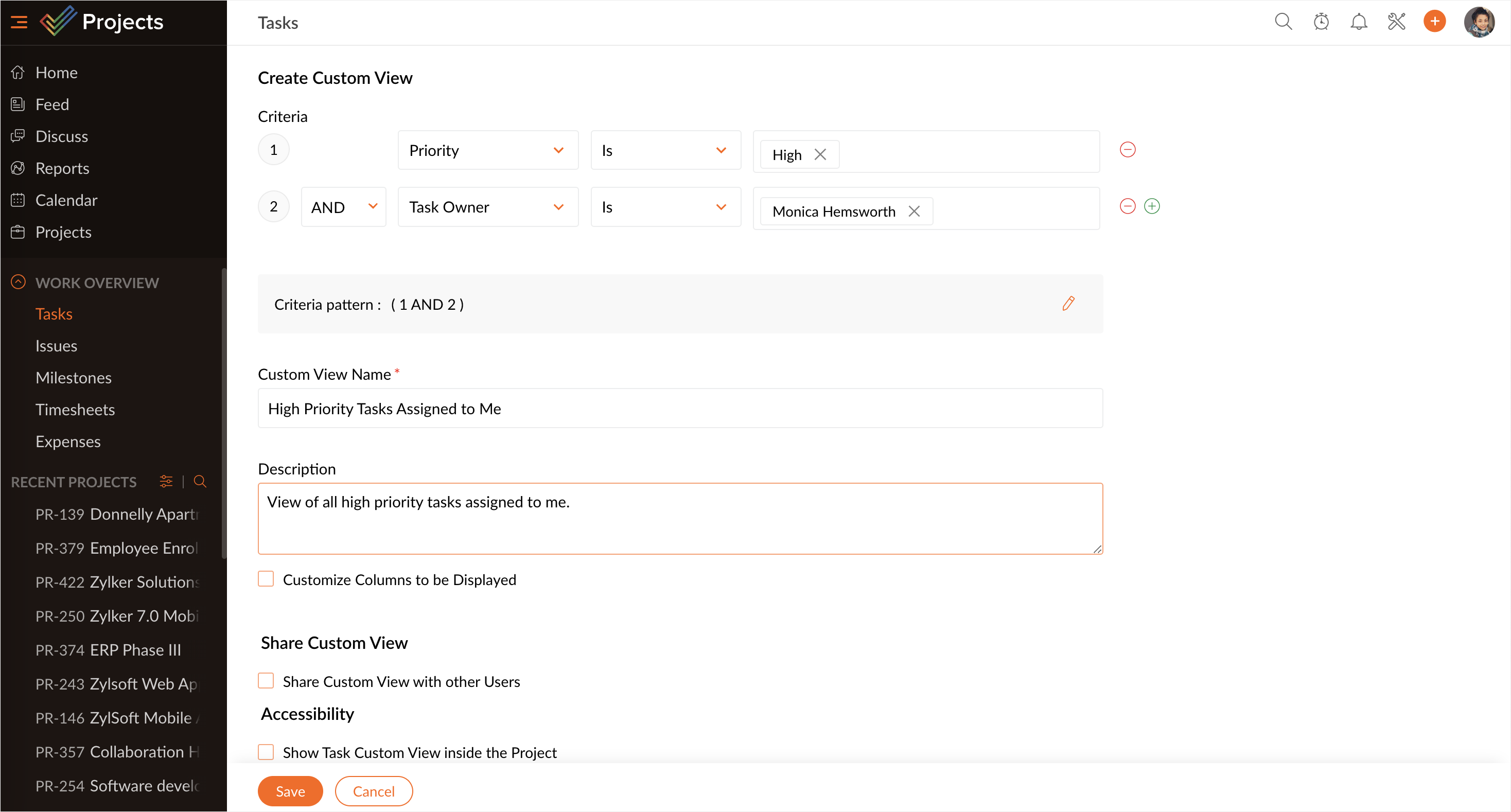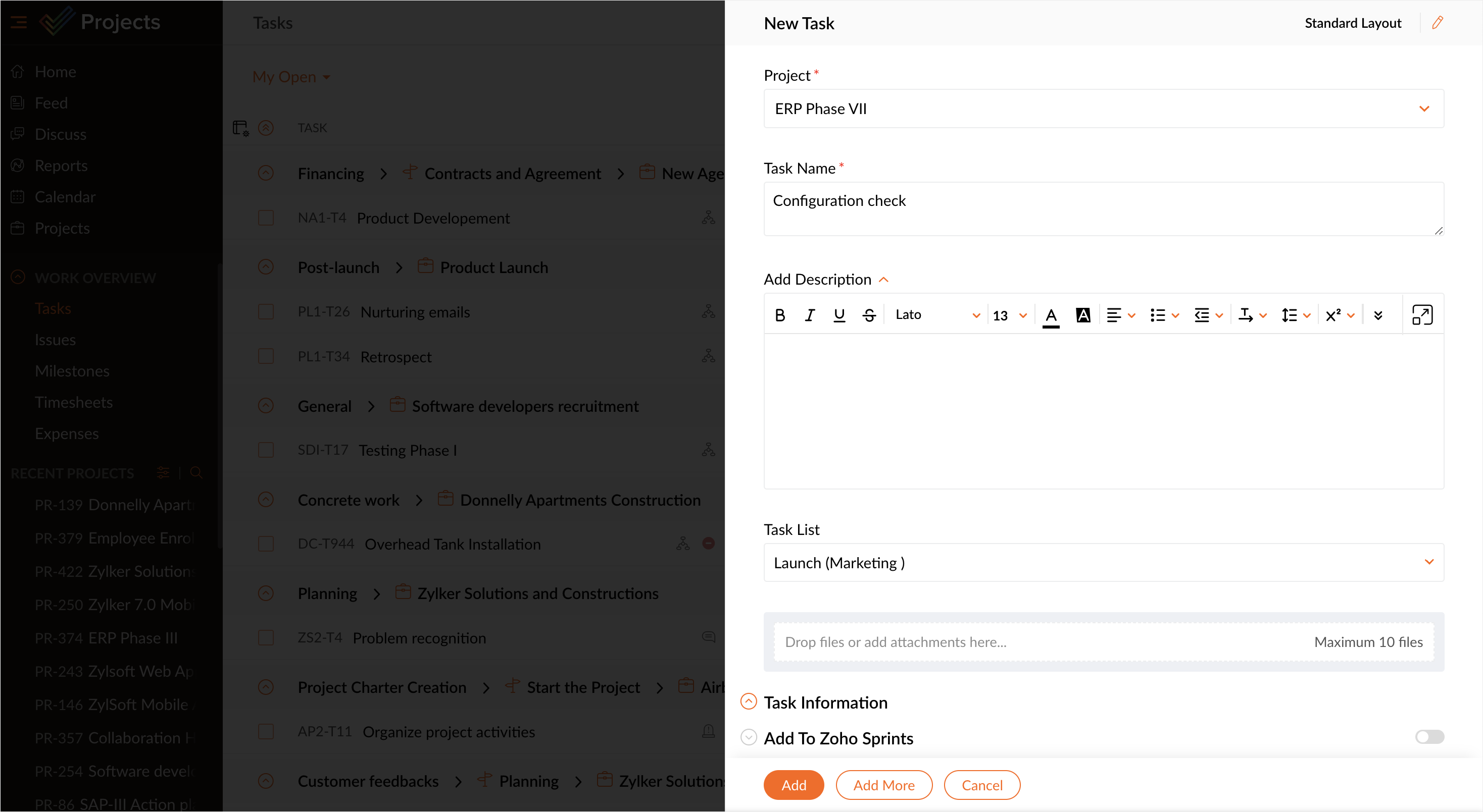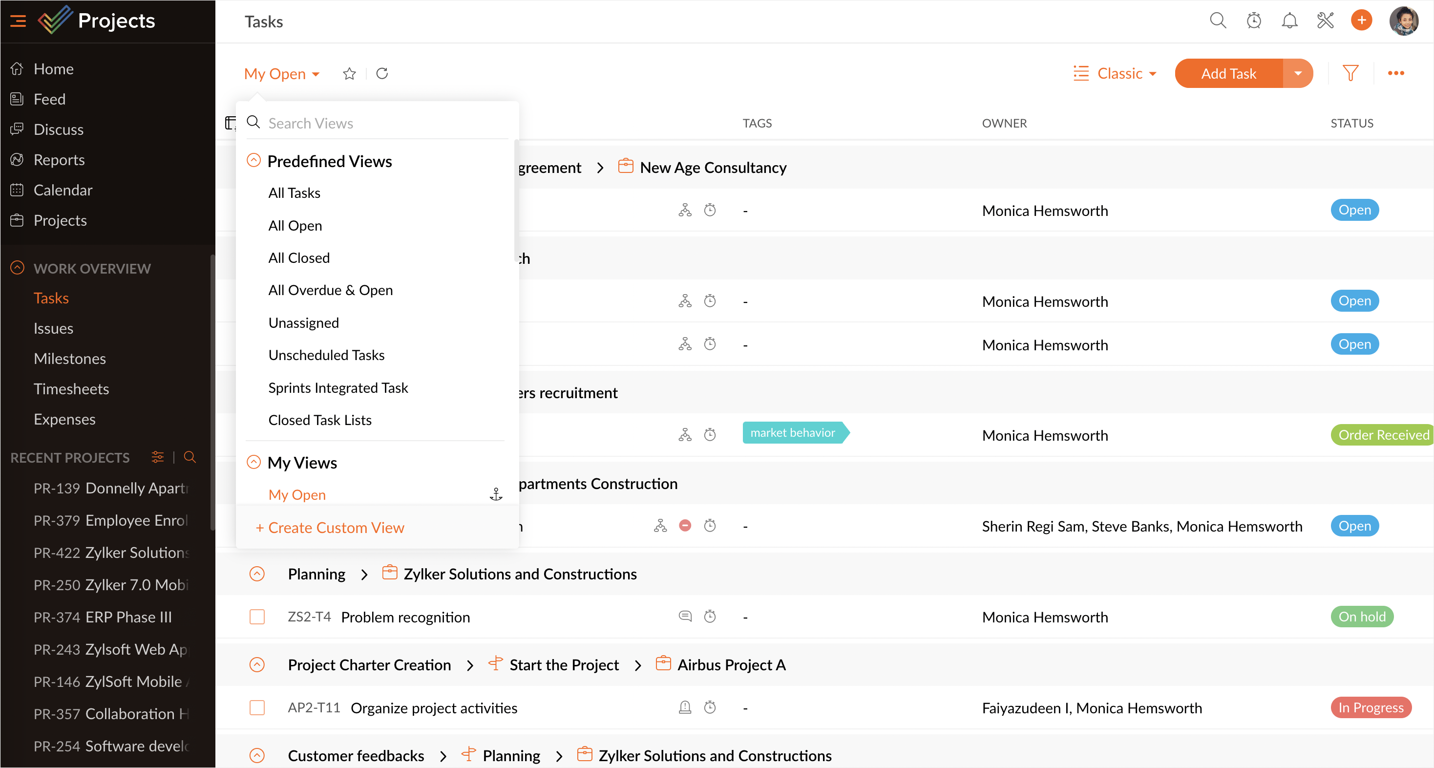 Zoho Projectsのタスクタブでは、プロジェクト内のすべてのタスクを確認できます。初期設定では、タスクの一覧には、すべての未完了のタスクが表示されます。ユーザーは、ドロップダウンメニューから初期設定またはカスタム表示に切り替えることができます。 ...