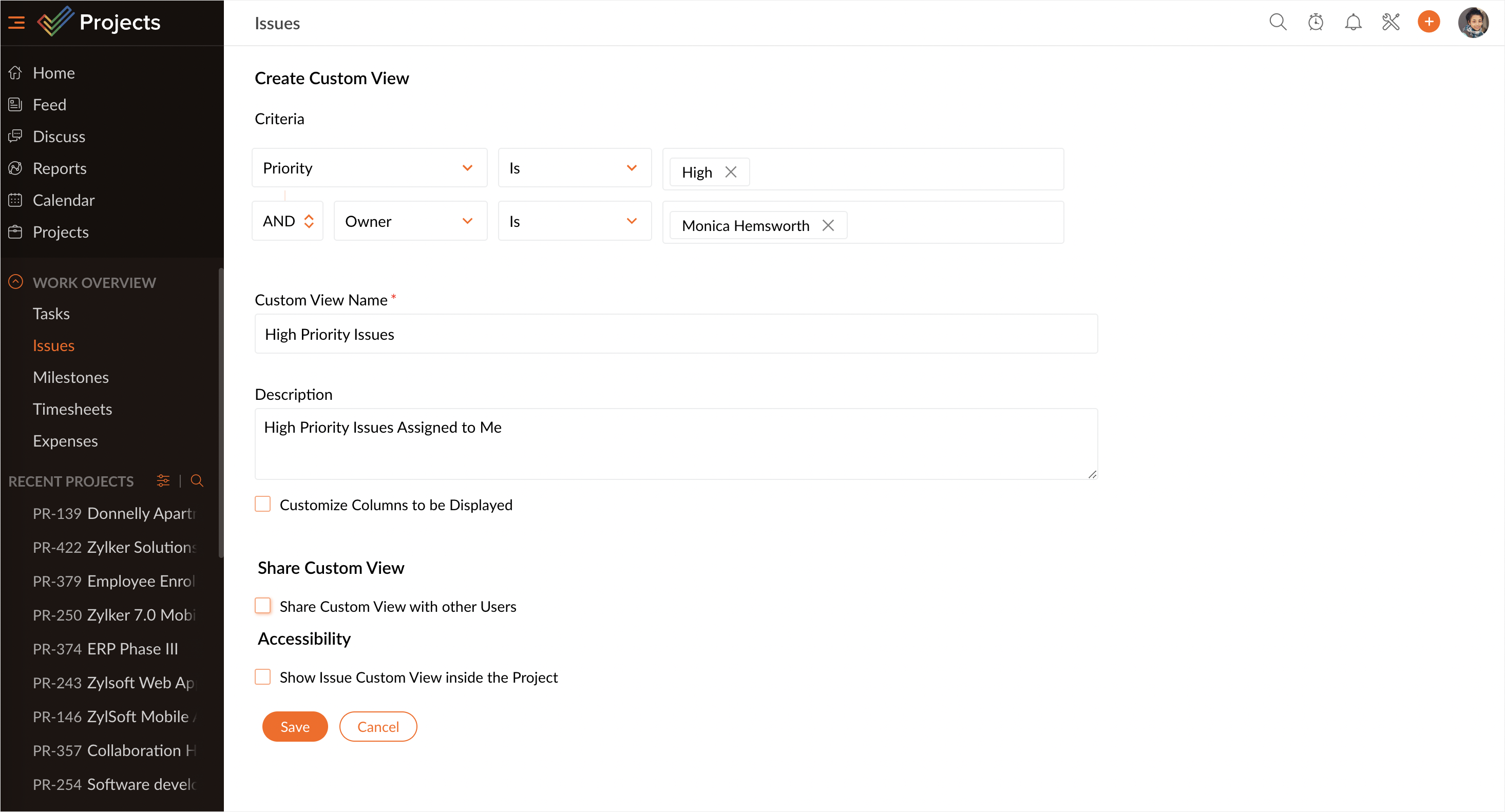 独自の条件を指定してデータ一覧を新しく作成することができます。たとえば、自分に割り当てられていて、かつ優先度が高い課題を抽出した一覧を作成することが可能です。新しい一覧の作成手順は次のとおりです。