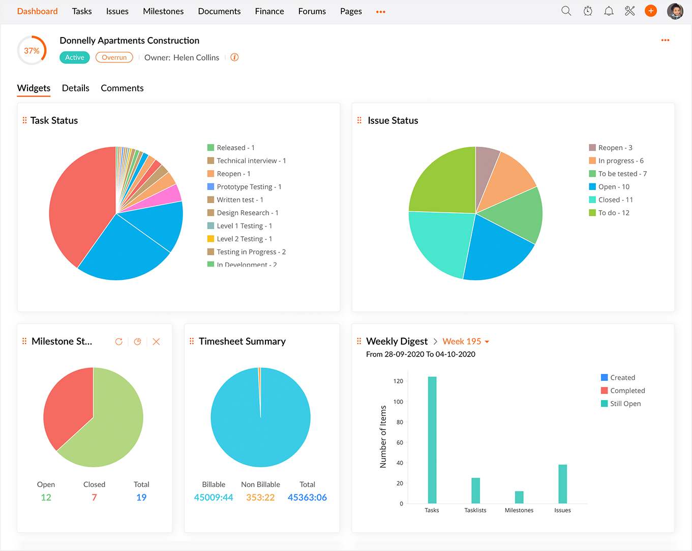 ウィジェット: [タスクの進捗グラフ] 、 [週単位の進捗] 、 [工数表の概要] 、 [課題のステータス] には、作業のステータスをレポートがグラフの形式で表示されます。