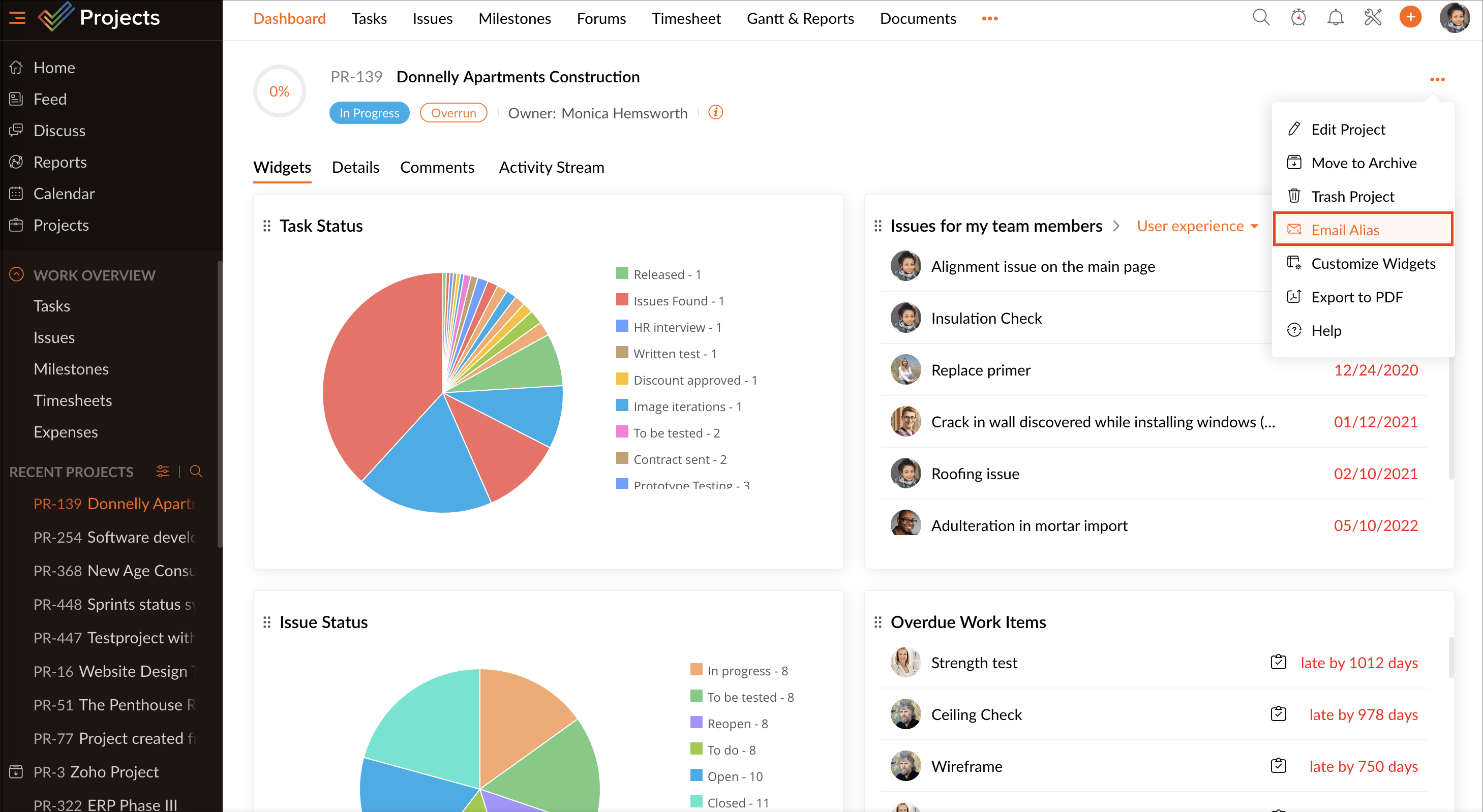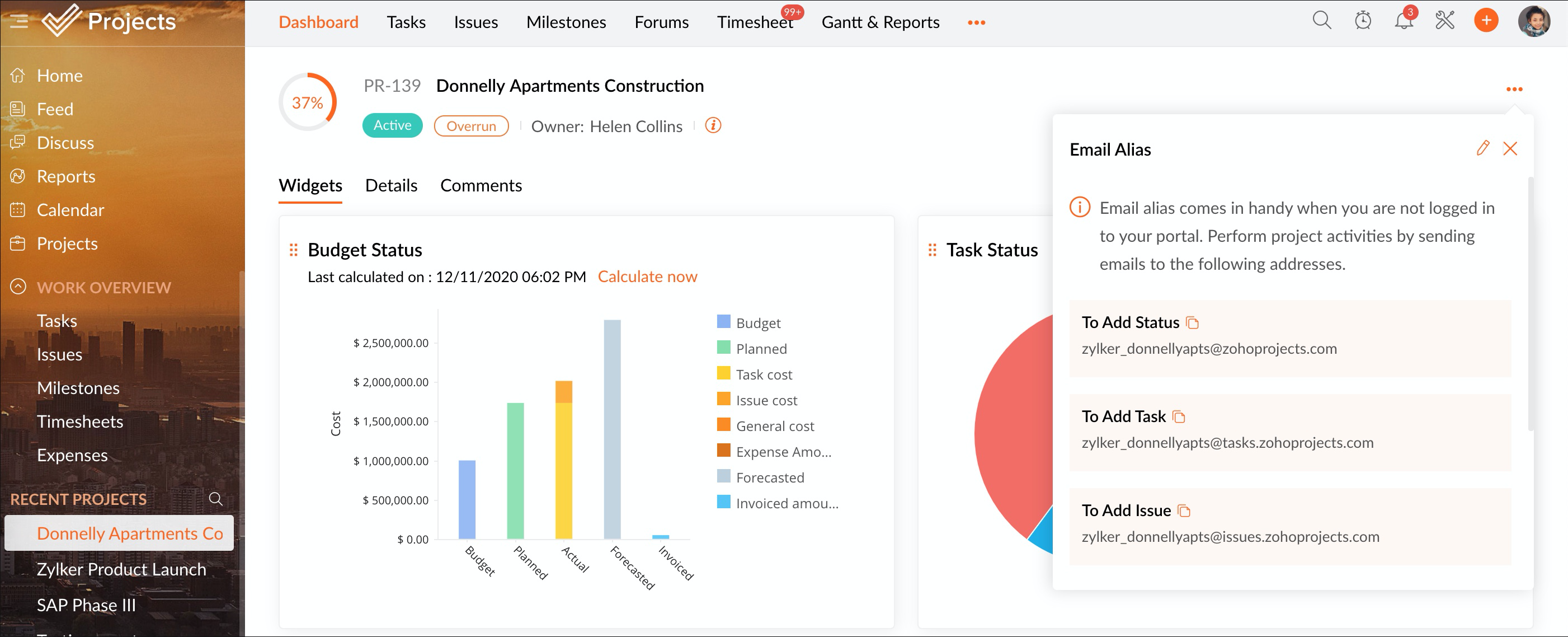 ダッシュボードから、プロジェクト情報を編集し、登録されたメールアドレスからZoho Projectsのポータルに作業項目を追加するためのメールアドレスを取得することもできます。