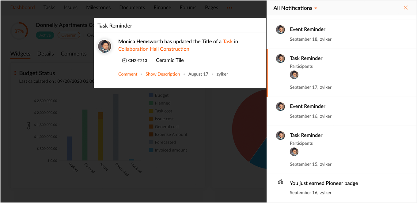 通知を使用して、プロジェクト内の最新情報を把握できます。上部バーの