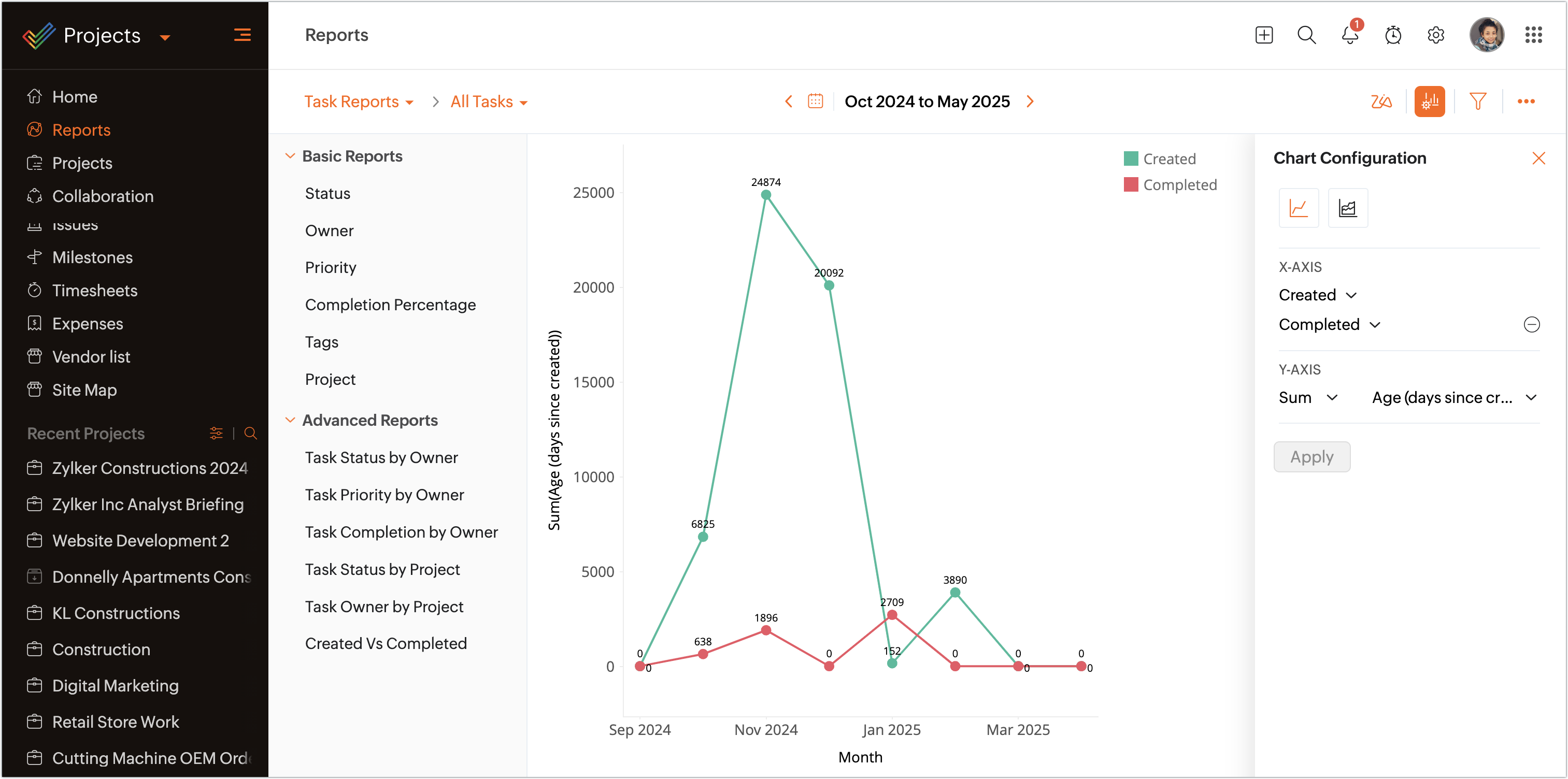 作成数と完了数の比較レポートを使用すると、ユーザーは特定の期間内に作成されたタスク数と、特定の期間内に完了したタスク数を比較できます。ユーザーは、作成日と完了日に基づいて、タスクの件数、合計、平均、最小値、最大値を表示できます。