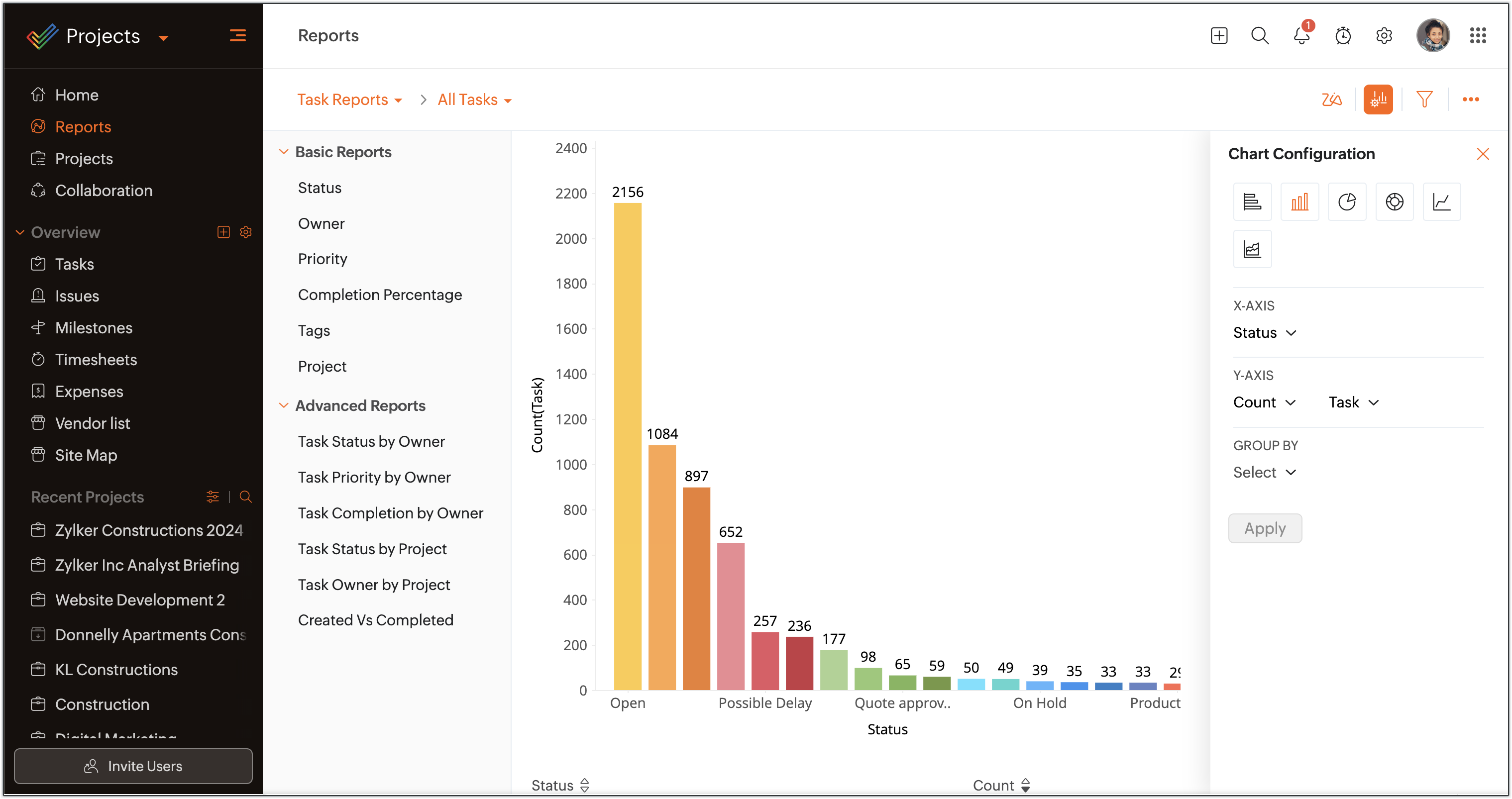 • プロジェクトごとのタスクのステータス:プロジェクトごとのタスク数がステータス別に表示されます。