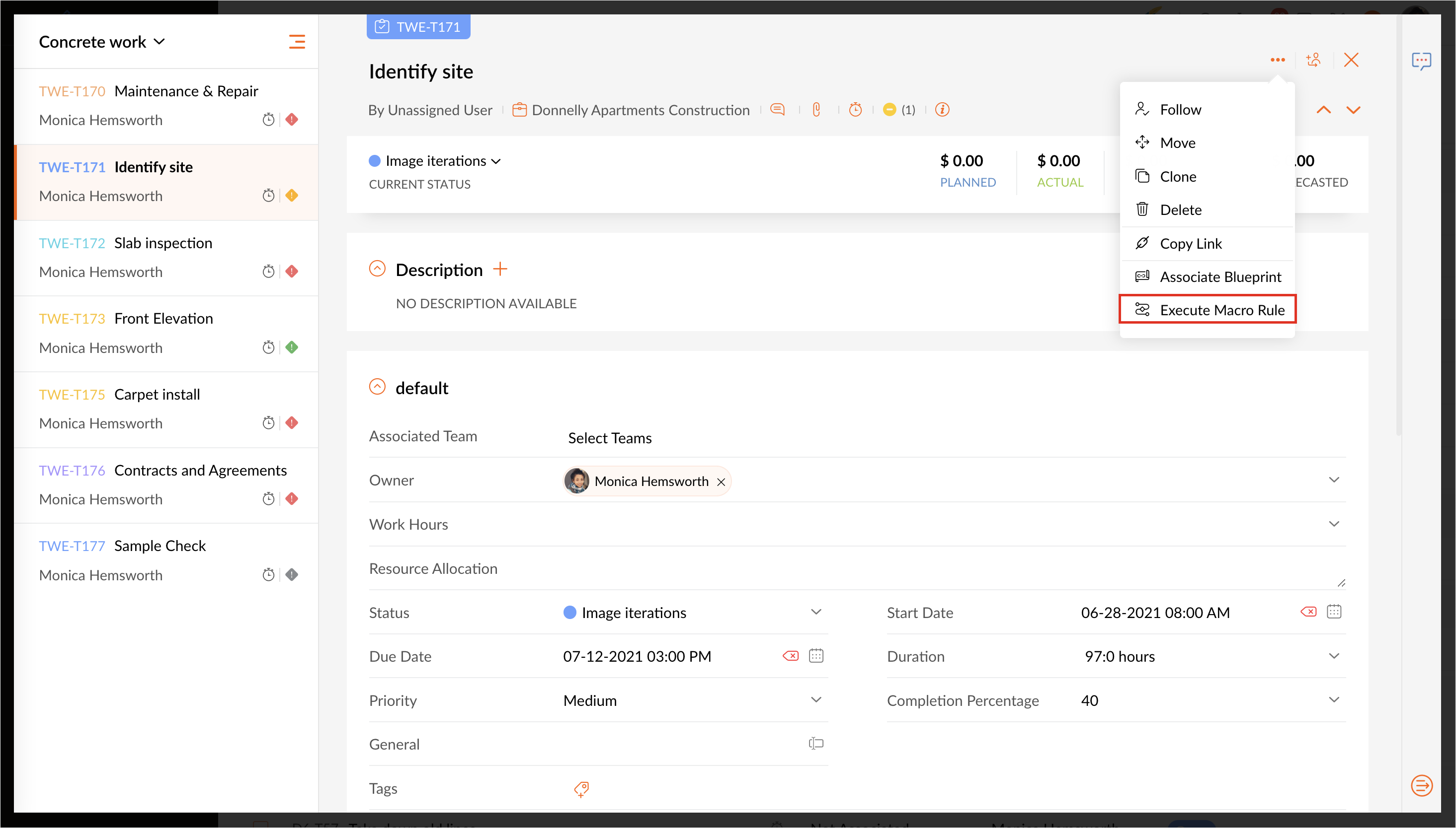 マクロのルールによる処理は、設定ページ、マイルストーンの詳細ページ、タスクリストの詳細ページ、タスクの詳細ページから実行できます。