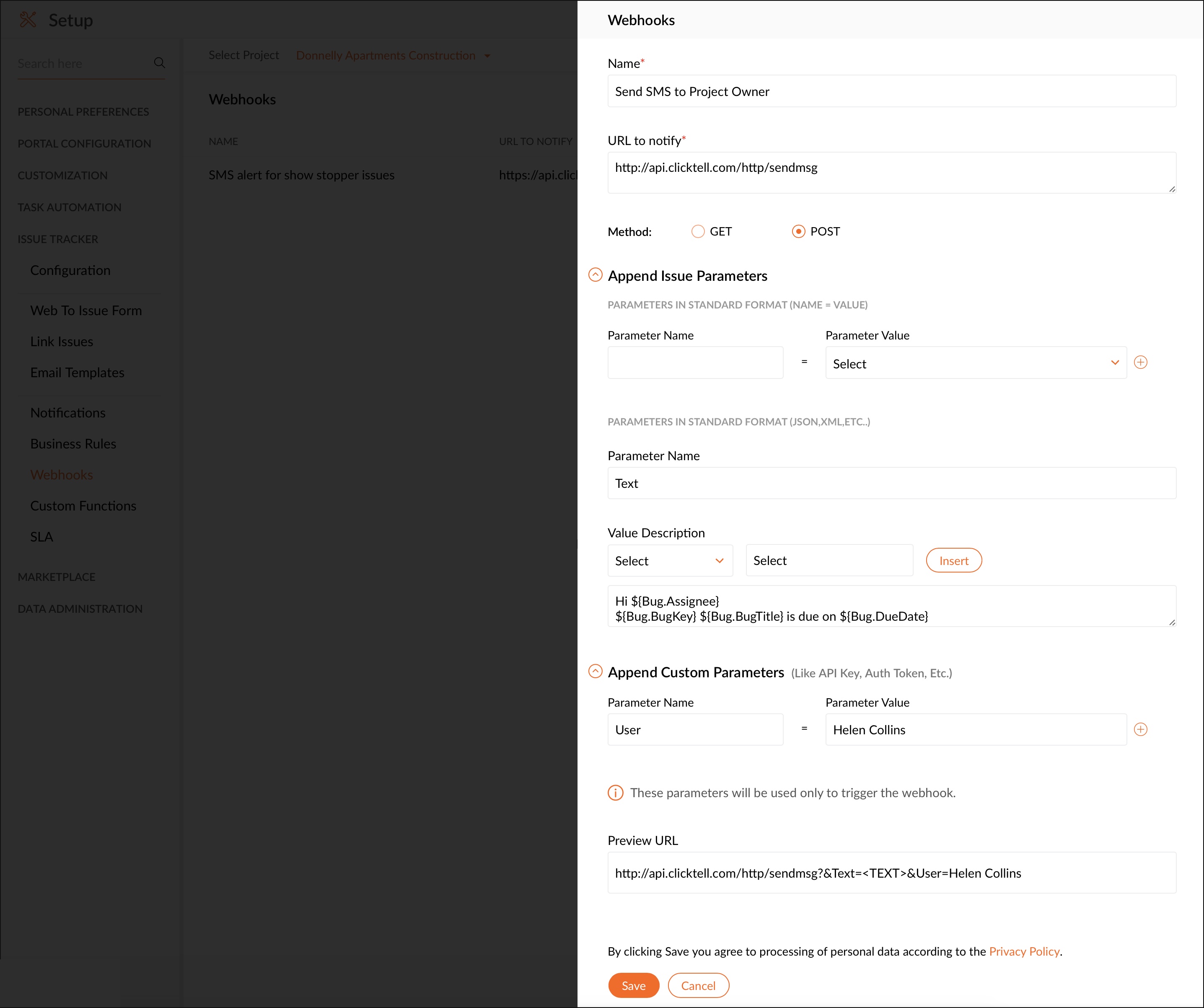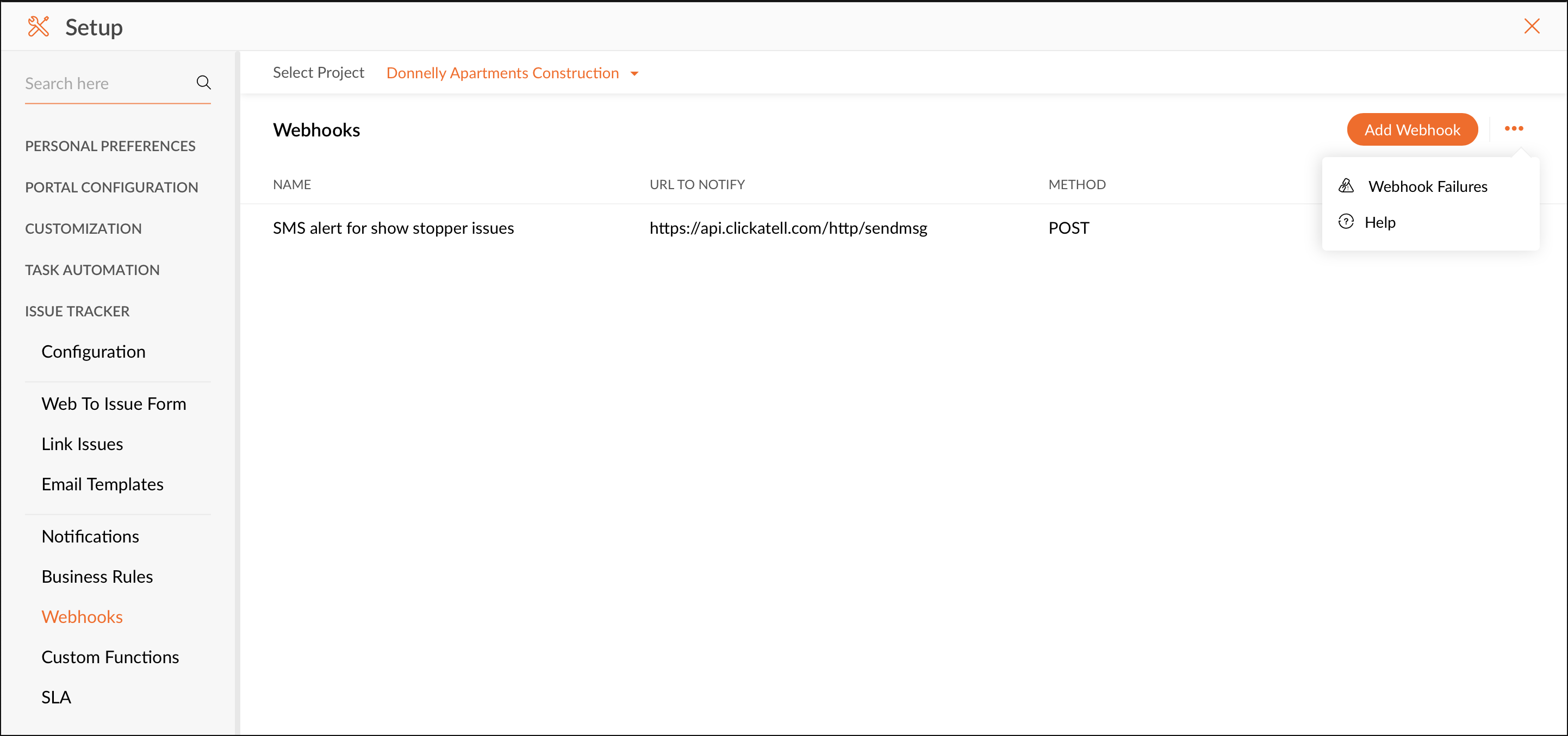 Webhookは、 Zoho Projects から他社アプリへの自動化HTTP通知を容易にする開発者向け機能です。Webhookを使用して、自分のHTTP URLを設定して、個別の業務ルールに関連付けることで、課題に関連するすべての通知やデータ送信処理を自動化できます。Webhookについての詳細は、 WebHooks.org をご参照ください。