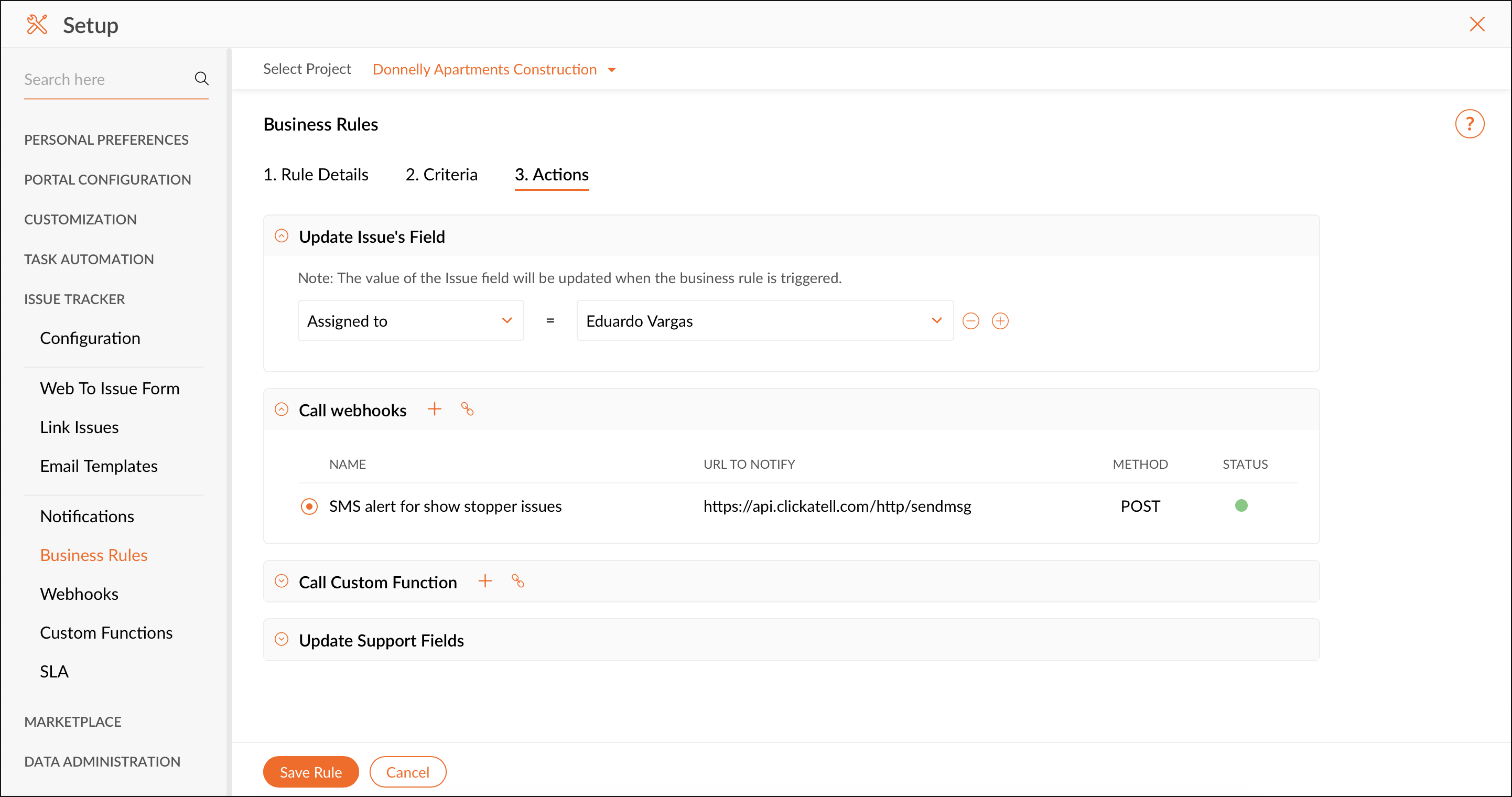 Webhookを業務ルールに関連付けることで、課題管理で課題を 「 致命的 」 とした場合に、課題の件名をつけてSMSをプロジェクト担当者に送信できます。