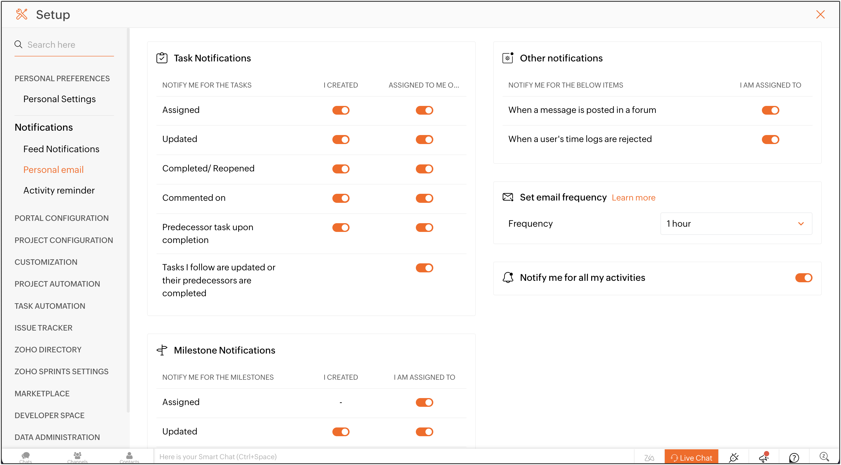 [個人設定]から、進行中のタスクや未割り当てのタスクのメール通知を設定します。