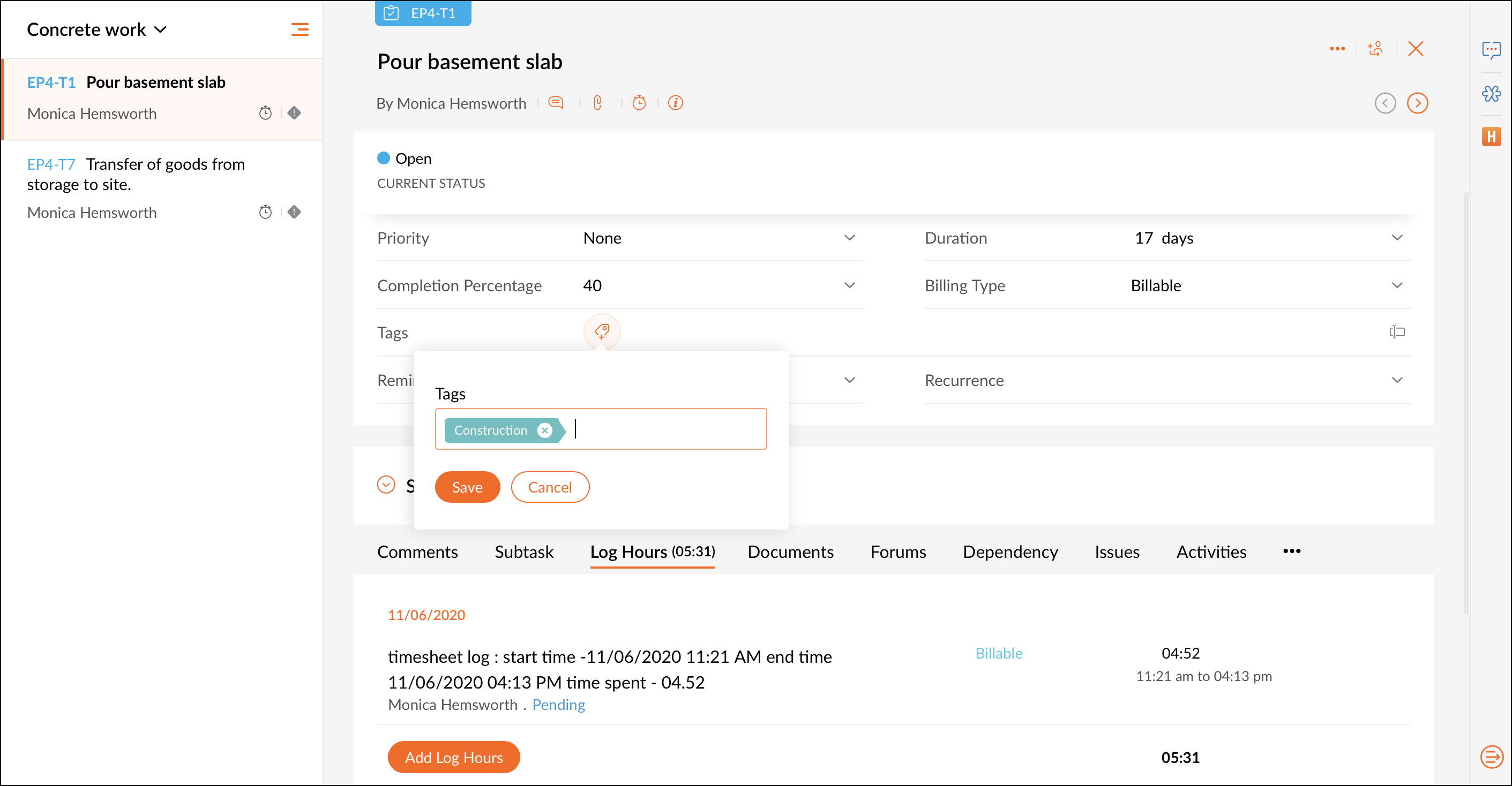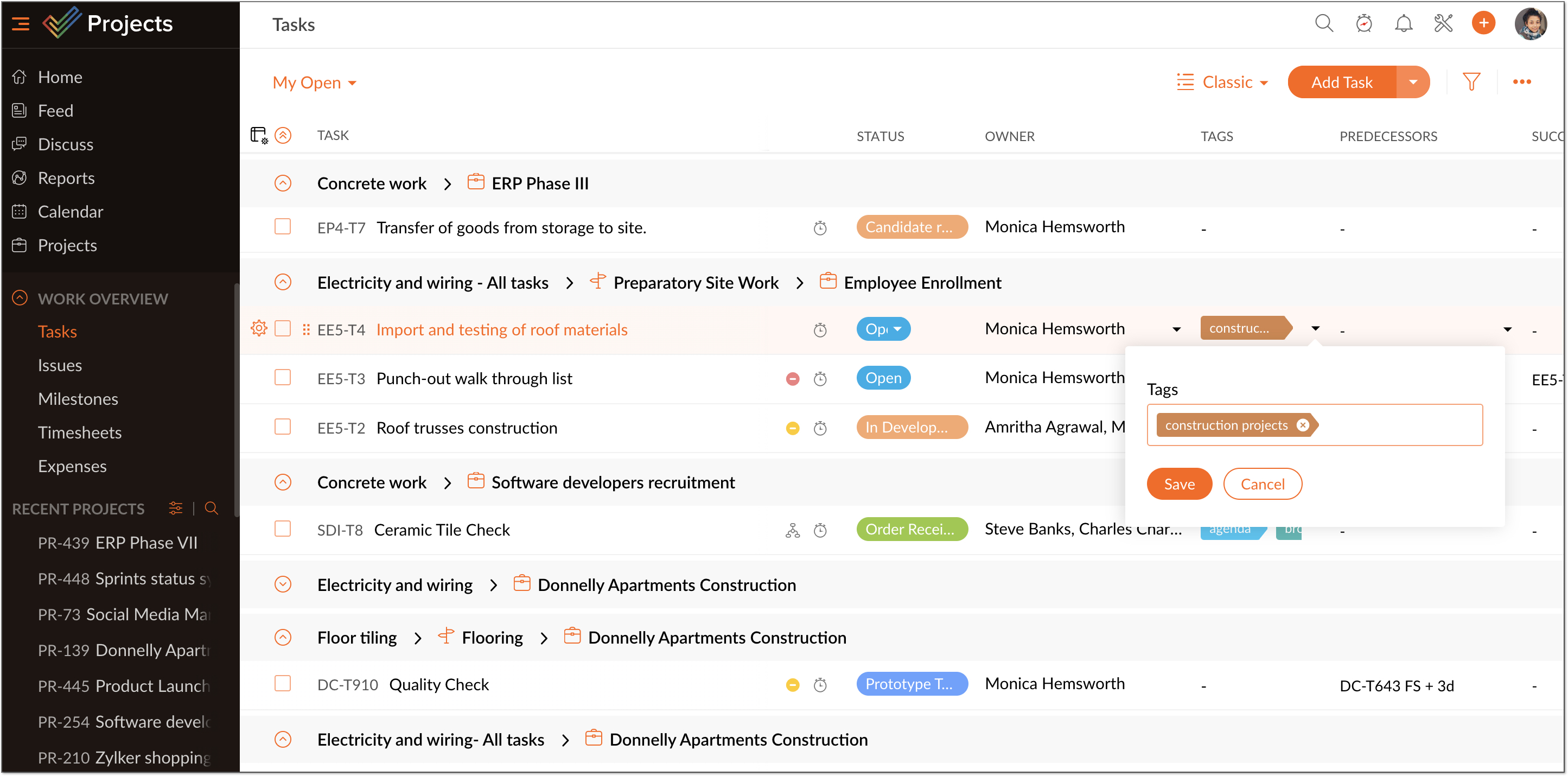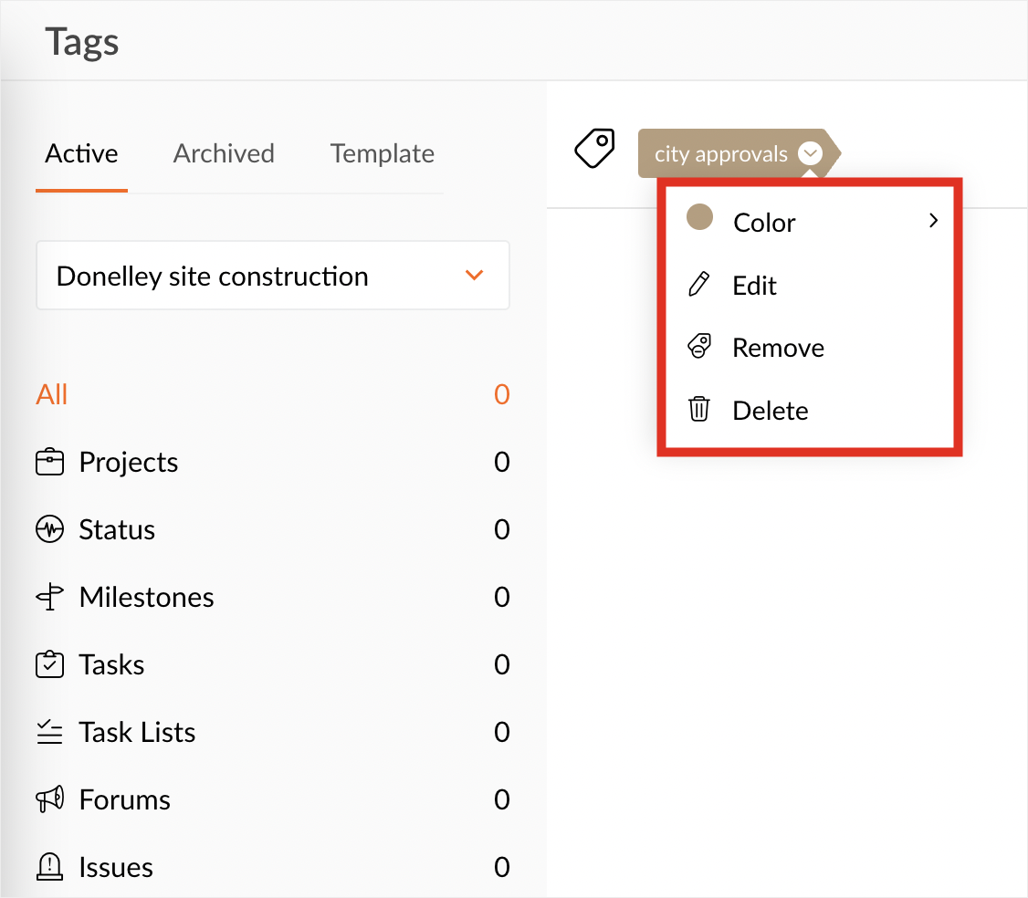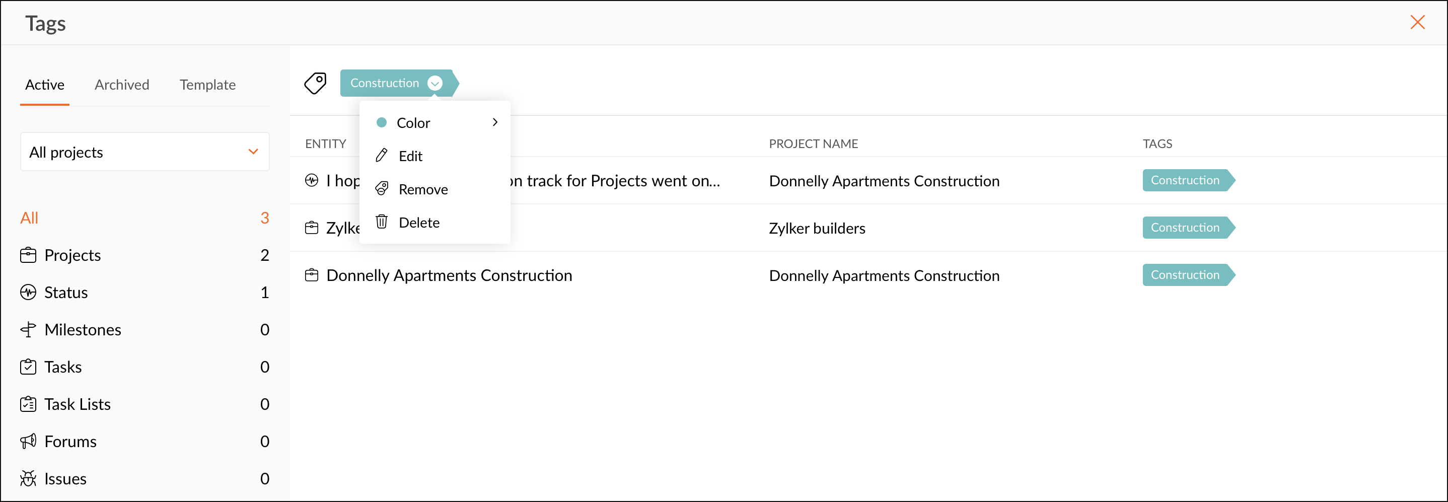 タグを使用すると、検索やフィルターでタブを参照するのに役立ちます。タグを有効にして、プロジェクト、マイルストーン、タスクリスト、タスク、課題、フォーラム、ステータスに関連付けられます。