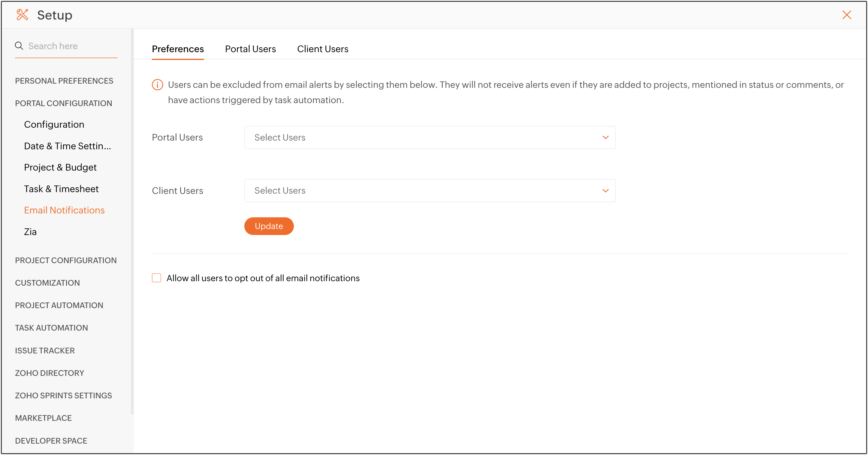 4. メール通知の送信対象から除外するユーザーを選択します(設定は任意です)。除外対象は、ポータルユーザーとクライアントユーザーのいずれについても選択可能です。選択が完了したら、[更新する]をクリックします。