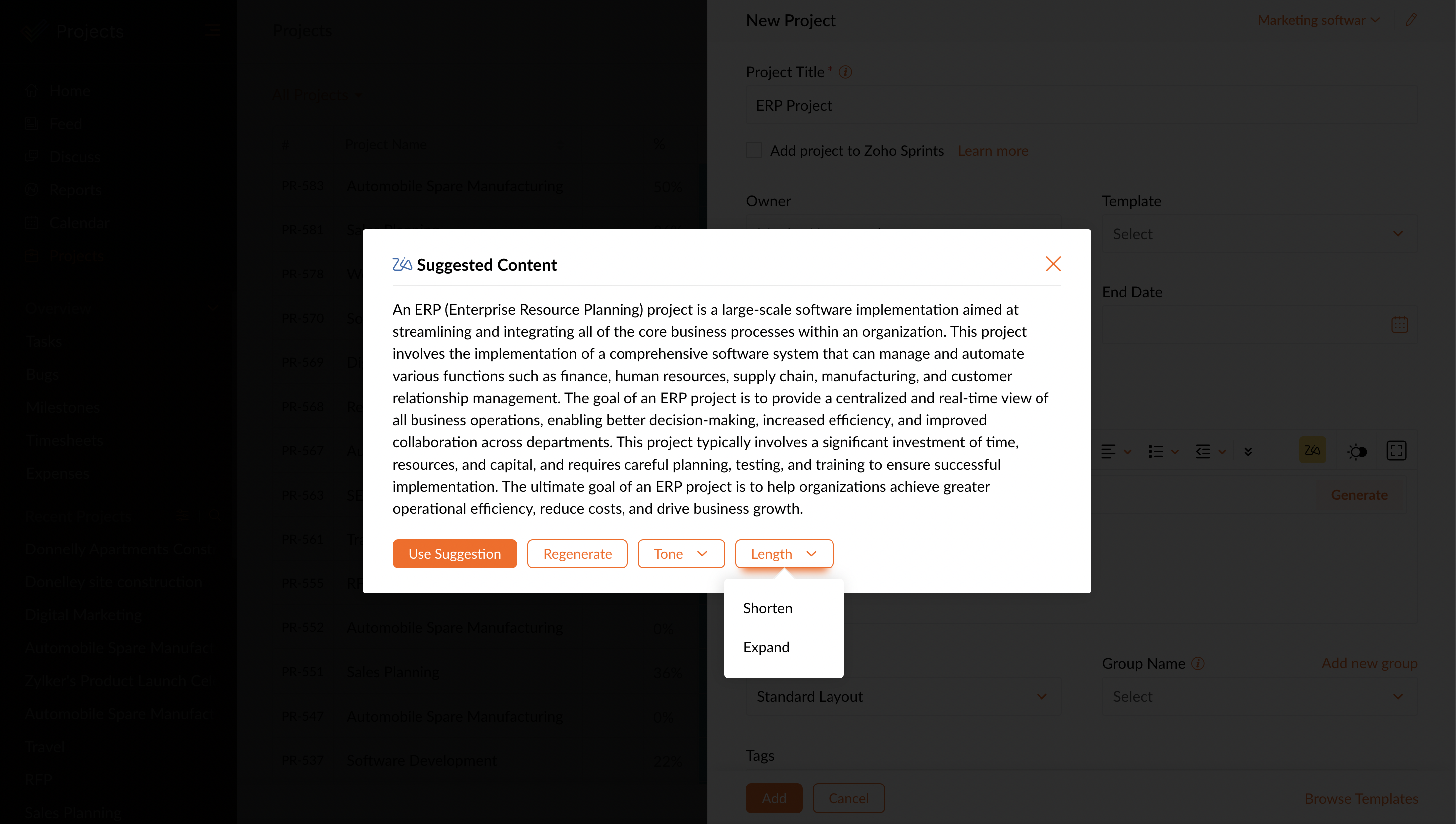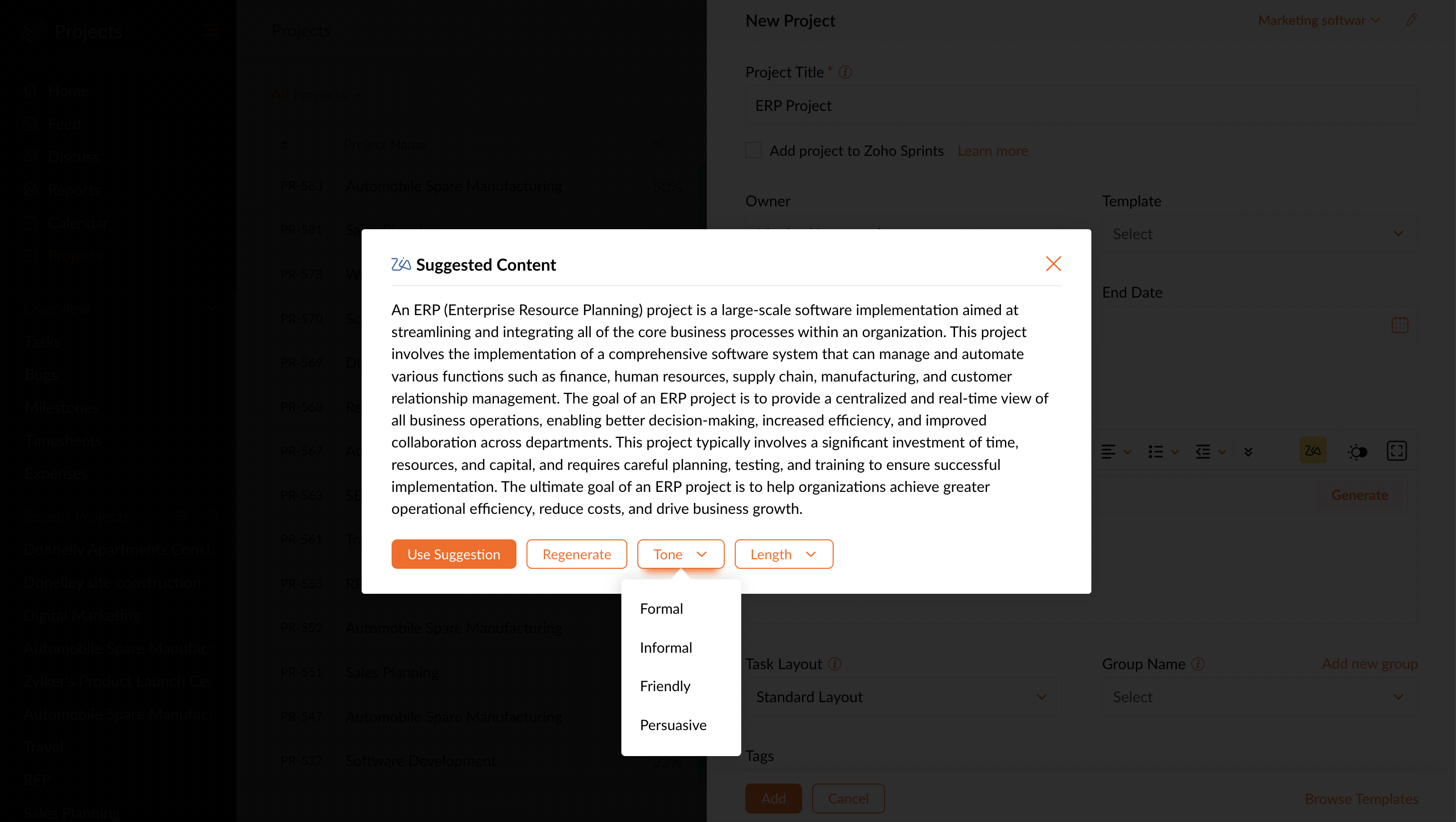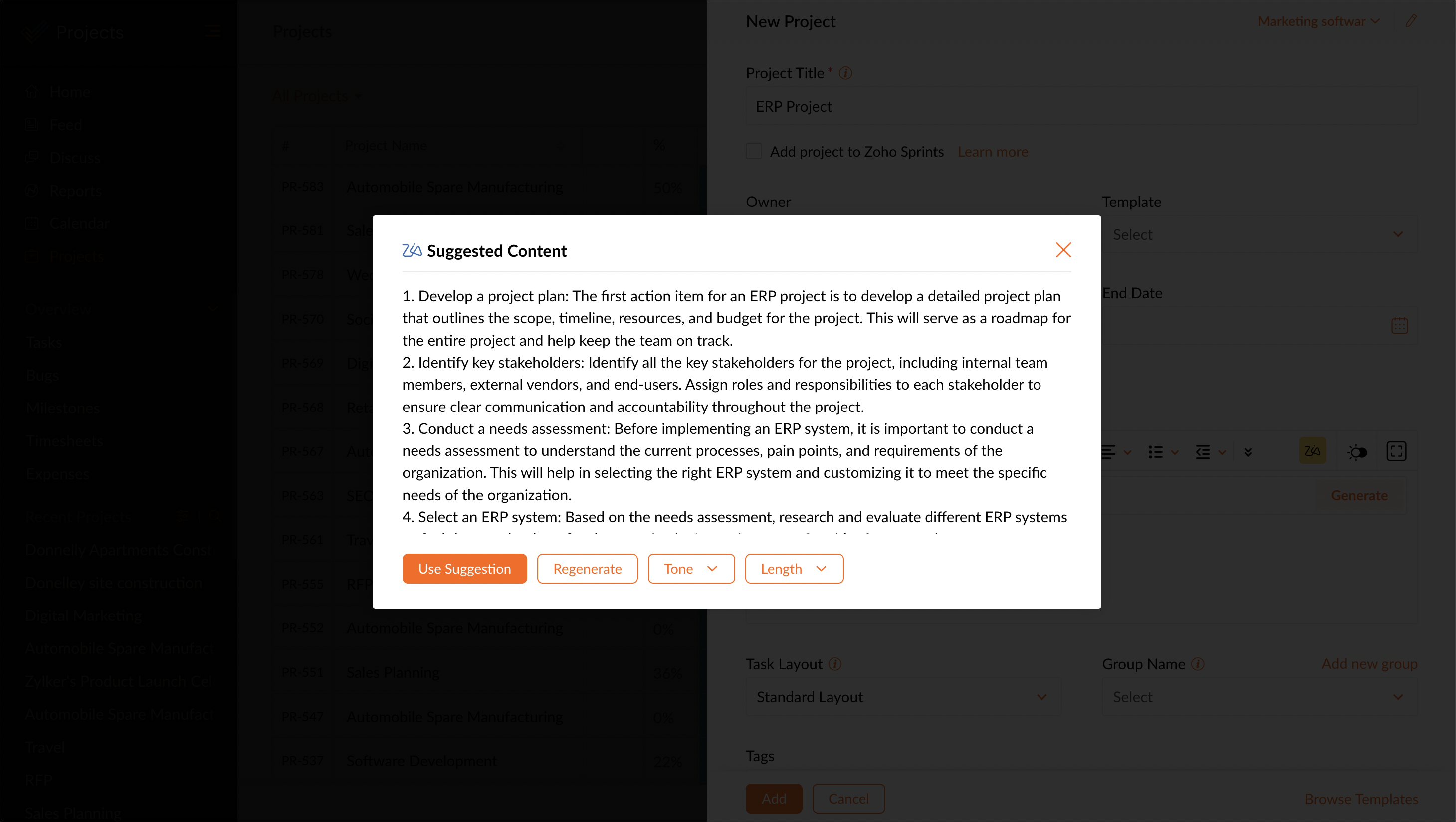 利用可能なプラン:Zoho Projectsのすべてのプランで利用できます。なお、OpenAIの有料プランが別途必要です。