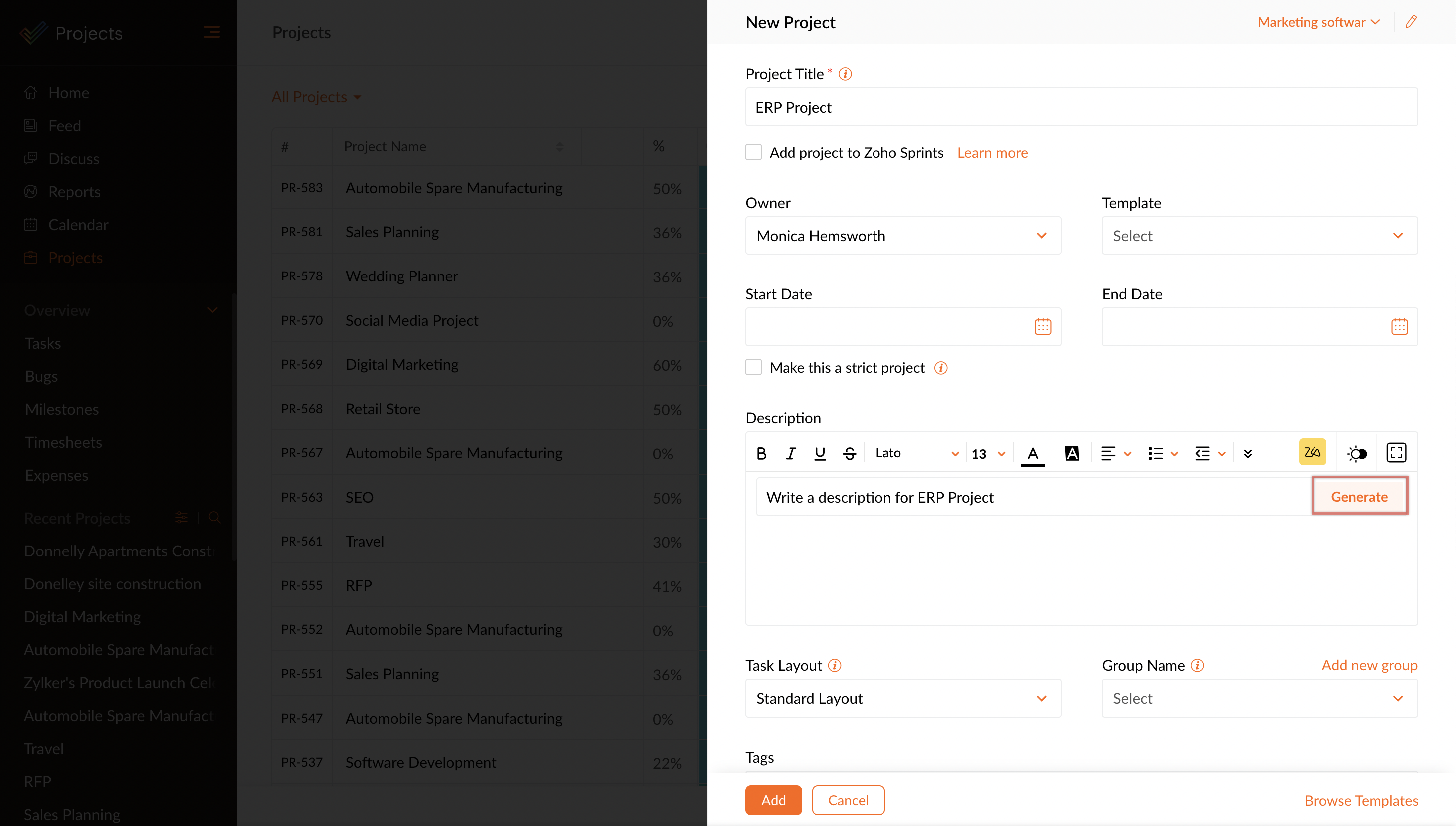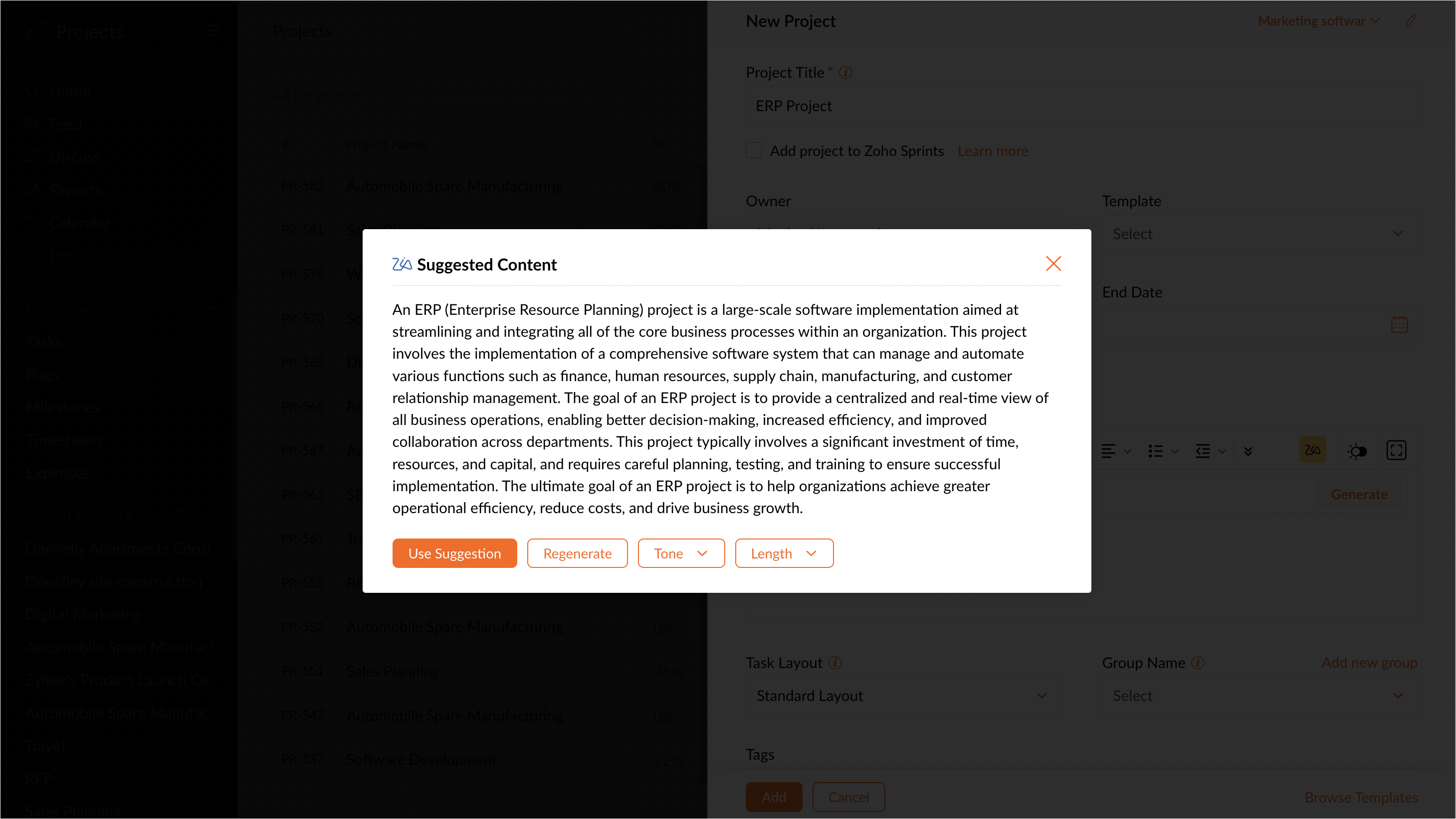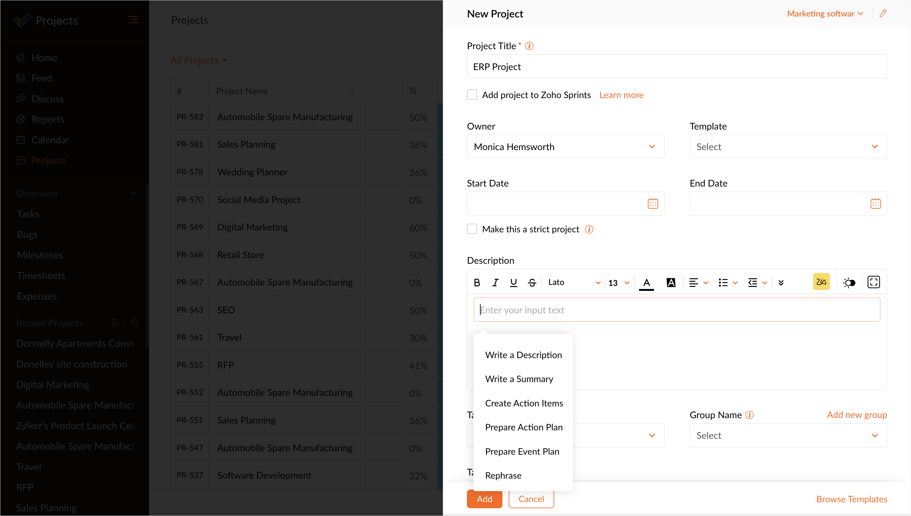 利用可能なプラン:Zoho Projectsのすべてのプランで利用できます。なお、OpenAIの有料プランが別途必要です。