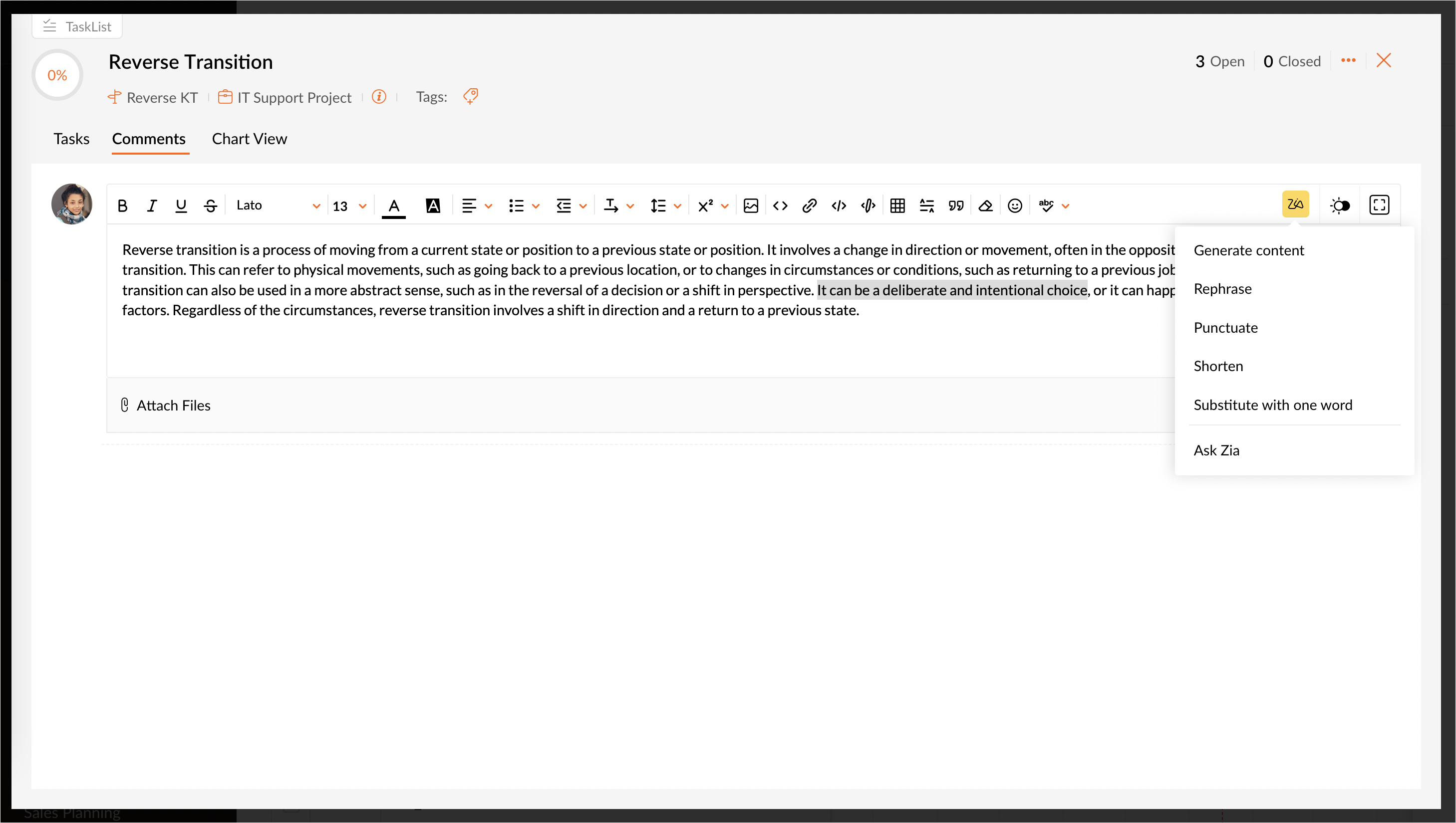 1. 説明文やコメント内のテキストを選択し、[Zia]をクリックします。