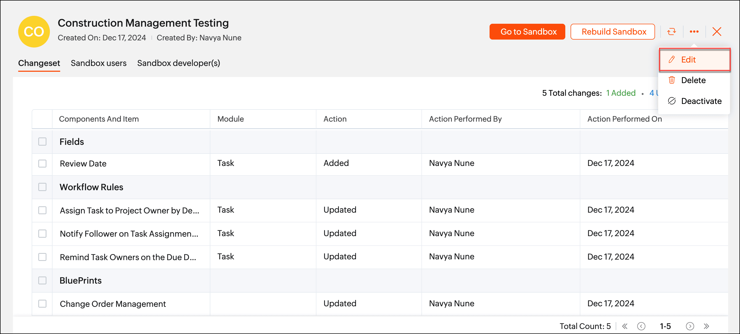 1. コンポーネントと項目:変更内容の詳細。例:サンドボックスで新規作成されたレイアウトは、コンポーネント内に表示され、レイアウト名が項目として表示されます。